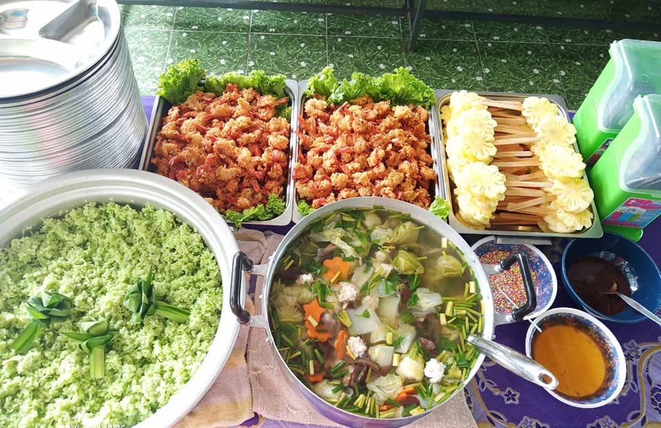 แกงจืดผักกาดขาวยัดไส้ ข้าวใบเตยหอม กุ้งชุปแป้งทอด ผลไม้สับปะรดภูแล