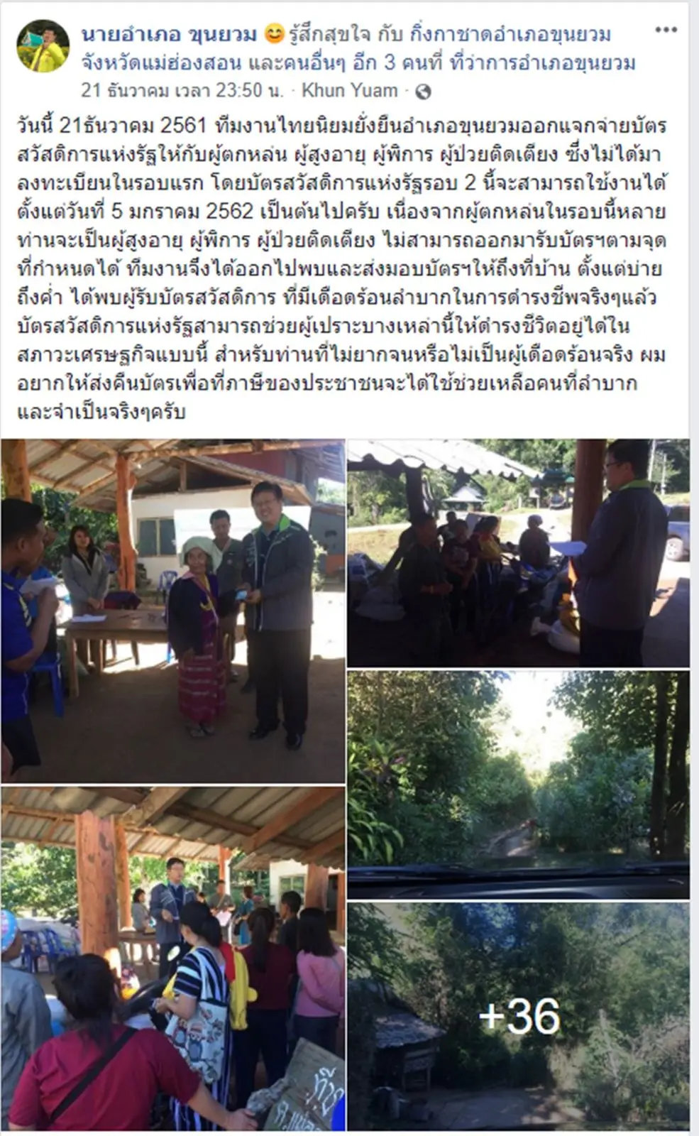 เมื่อวันที่ 21 ธ.ค. ที่ผ่านมา ว่าที่ร้อยตรีรณรงค์ชัย จินดาพันธ์ นายอำเภอขุนยวม จ.แม่ฮ่องสอน นำคณะเจ้าหน้าที่ของฝ่ายปกครองอำเภอฯ เดินทางไป มอบ / แจกจ่าย บัตรสวัสดิการแห่งรัฐให้แก่ผู้มีสิทธิ ณ บ้านคำสุข พื้นที่ตำบลแม่อูคอ อ.ขุนยวม จ.แม่ฮ่องสอน จำนวน 49 รายว่าที่ร้อยตรีณรงค์ชัย กล่าวว่า ทีมงานไทยนิยมยั่งยืนอำเภอขุนยวม ออกเดินทางไป แจกจ่ายบัตรสวัสดิการแห่งรัฐให้กับผู้ตกหล่น ผู้สูงอายุ ผู้พิการ ผู้ป่วยติดเตียง ซึ่งไม่ได้มาลงทะเบียนในรอบแรก โดยบัตรสวัสดิการแห่งรัฐรอบ2 นี้จะสามารถใช้งานได้ตั้งแต่วันที่ 5 มกราคม 2562 เป็นต้นไป