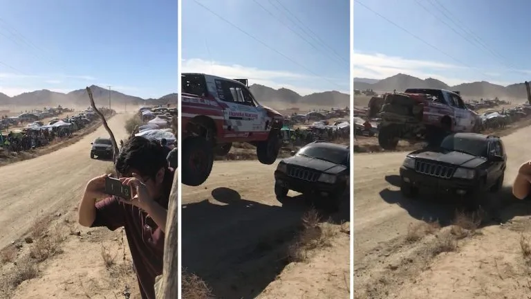 เว็ปไซต์ storytrender.com ได้เผยแพร่คลิปวิดีโอเหตุการณ์สุดหวาดเสียว ที่ถูกถ่ายโดย Kyle Douglas ในวิดีโอดังกล่าวแสดงให้เห็นภาพรถแข่งบาฮาออฟโรด ในขณะเหินลงมาเฉียวกับรถ jeep ที่แล่นสวนมาอย่างหวุดหวิด ซึ่งรถแข่งคันดังกล่าวได้ขับผ่านเลยไปอย่างต่อเนื่อง