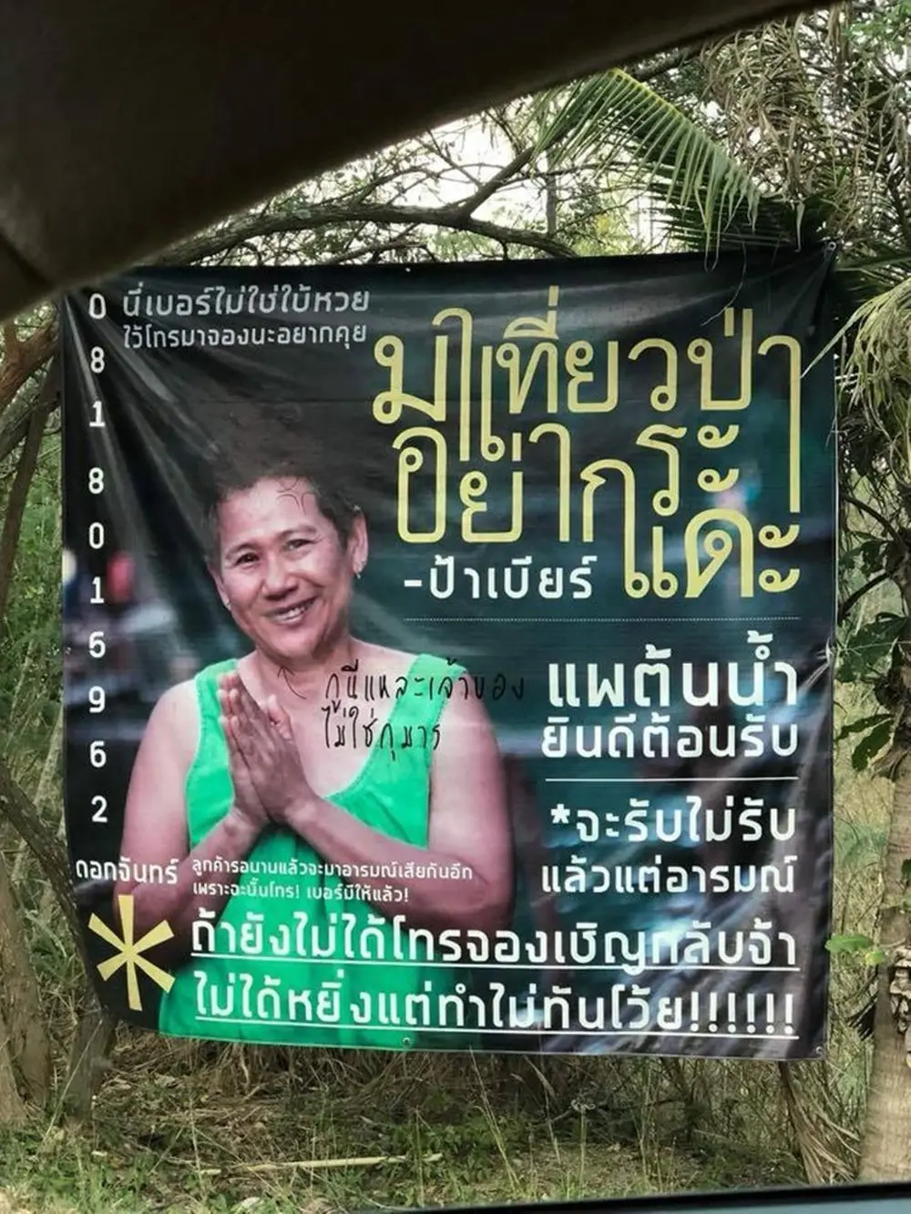 กลายเป็นภาพที่ทำเอาโลกออนไลน์แชร์กันสนั่น เมื่อผู้ใช้เฟซบุ๊กที่ใช้ชื่อว่า S e n s e ジ ャ ス ト ア ナ ザ ได้โพสต์ภาพการชวนเที่ยวของแพแห่งหนึ่ง โดยเป็นภาพของคุณป้ายกยิ้มไหว้ยิ้มแย้มดูเหมือนเชิญชวนให้ทุกคนเข้ามาเที่ยว แต่สิ่งที่ทำให้ชาวเน็ตพากันทึ้ง คือข้อความที่อยู่บนภาพของป้า เช่น"มาเที่ยวป่าอย่ากระแดะ"แถมยังมีข้อความว่า หญิงในรูปนี่แหละคือเจ้าของไม่ใช่กุมาร และถ้าจะมาเที่ยวยังต้องโทรมาจอง ถ้าไม่ได้จองให้เชิญกลับไปได้เลยจนทำให้ชาวเน็ตแห่แชร์ไป เพราะถือเป็นการเชิญชวนท่องเที่ยวแบบแปลกแหวกแนวมากนั่นเอง