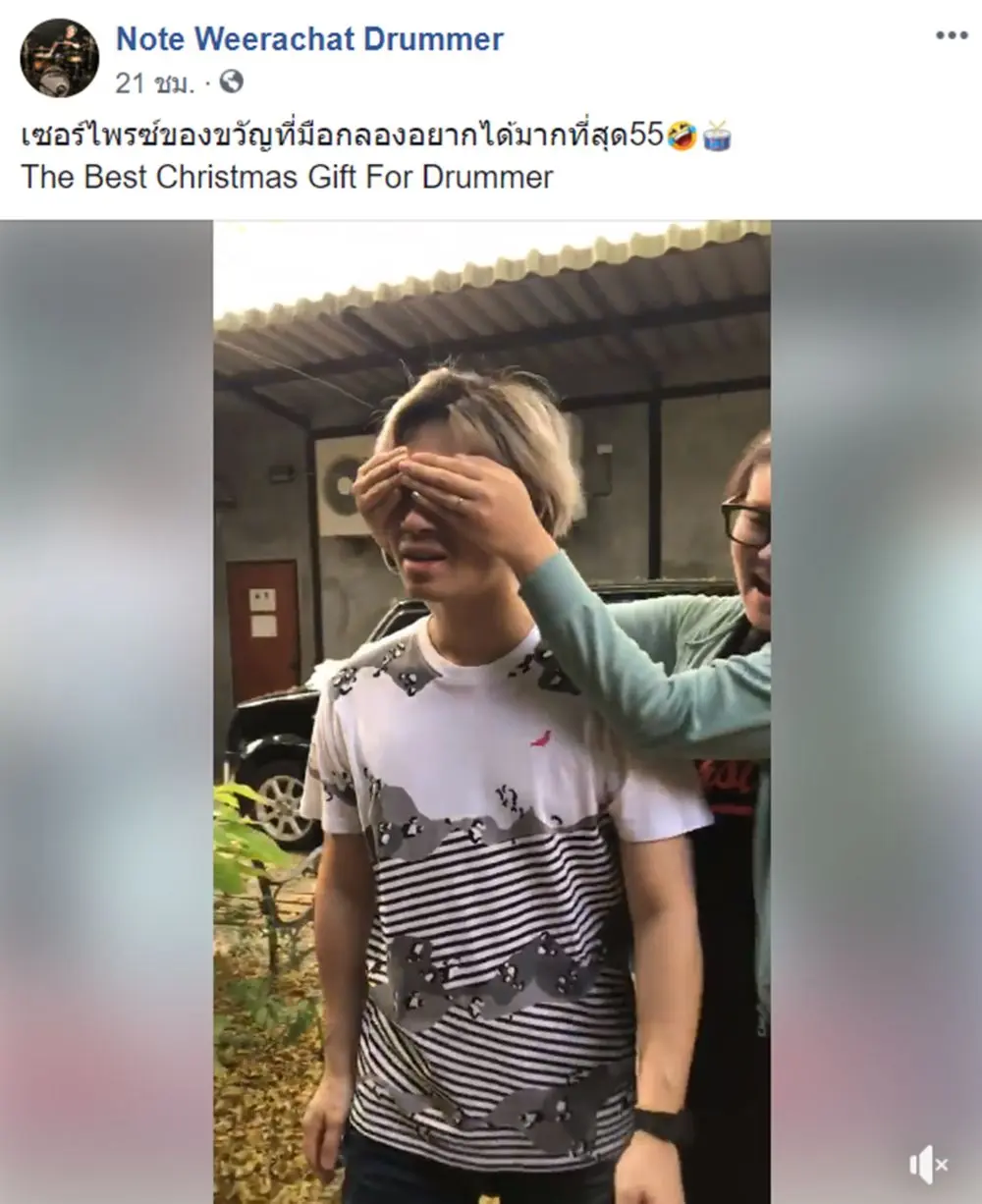 กลายเป็นอีกหนึ่งเรื่องราวน่ารัก ๆ ที่มีการแชร์ส่งต่อกันอย่างมากมายในโลกโซเชียลขณะนี้ สำหรับกรณีเมื่อเฟซบุ๊กชื่อ "Note Weerachat Drummer" ได้โพสต์ภาพการเซอร์ไพรส์ของขวัญวันคริสต์มาสให้กับมือกลอง พร้อมข้อความบรรยายเอาไว้ว่า..."เซอร์ไพรซ์ของขวัญที่มือกลองอยากได้มากที่สุด55 The Best Christmas Gift For Drummer" งานนี้เรียกรอยยิ้มให้กับชาวเน็ตแบบสุด ๆ โดยในคลิปวิดีโอดังกล่าวนั้นจะปรากฏภาพที่ หญิงคนหนึ่งกำลังปิดตาชายคนหนึ่ง (มือกลอง) พร้อมกับบอกให้เดินมาดูของขวัญวันคริสต์มาสที่เตรียมไว้ให้ และเมื่อมาถึงของขวัญชิ้นดังกล่าวจึงได้ทำการเปิดตา ก่อนที่หนุ่มมือกลองจะพบว่ามีของขวัญวางอยู่ตรงหน้า ลักษณะเป็นกลองชุด จึงได้แกะของขวัญดังกล่าวออกดู ก่อนจะยิ้มและหัวเราะออกมา เมื่อภายในเป็นคุกกี้กล่องสีแดงยอดนิยม มือกลองหนุ่มจึงได้ทำการโชว์ตีกลองเสียเลยอย่างไรก็ตาม เรื่องราวดังกล่าวได้รับความสนใจจากชาวเน็ตอย่างมากมาย มีการเมนต์แสดงความรู้สึก บอกว่าเป็นการเซอร์ไพรส์ที่น่ารัก ทั้งยังมีการชมหนุ่มมือกลองด้วยว่าถึงเป็นกลองกล่องคุกกี้ แต่ก็สามารถตีเป็นจังหวะได้อย่างไพเราะ อีกทั้งคลิปวิดีโอดังกล่าวยังมีผู้เข้าชมมากกว่า 6 แสนวิว ยอดแชร์อีกเกือบหมื่น