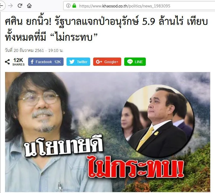 ข่าวที่ว่า “ศศิน ยกนิ้ว! รัฐบาลแจกป่าอนุรักษ์ 5.9 ล้านไร่ เทียบทั้งหมดที่มี ‘ไม่กระทบ’” (https://bit.ly/2GFHGL5) . . . คิดได้ไง แม้นายศศินบอกต่อมาว่า “เขาแค่จัดทำแนวเขตชุมชนให้ชัด เป้าหมายคือแก้ปัญหาเรื่องเจ้าหน้าที่ขัดแย้งจับชาวบ้านกลางป่า มีข่าวรังแกคนยากจนที่อยู่มาก่อนหรือ อยู่มานานแล้ว และให้ชาวบ้านเองทราบแนวเขตที่ตกลงกันให้ชัดจะได้ไม่รุกเพิ่ม ถ้ามีรุกเพิ่มจากแนวนี้ก็จะจับกุมกันเคร่งครัด” (https://bit.ly/2EMUVb9)