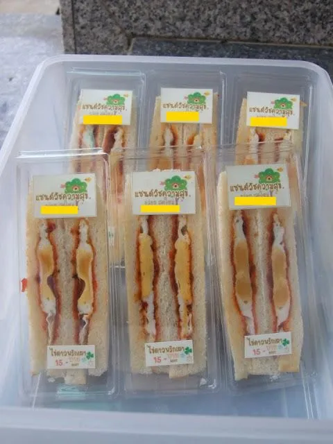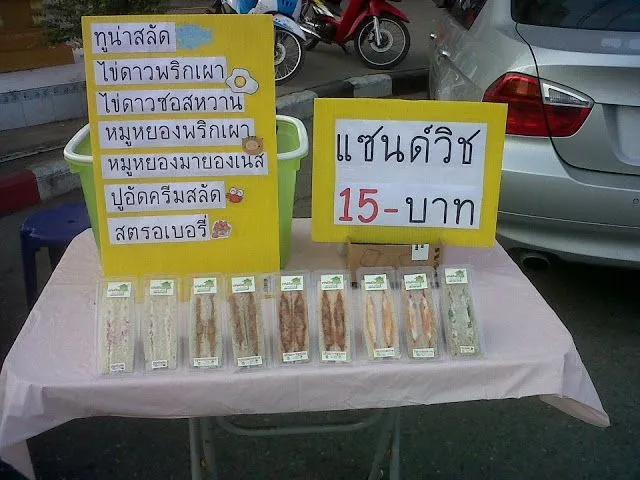 เราเริ่มขายแซนวิชโดยตื่นขึ้นมาทำตอนตี 4 ออกขายตอน 5:30 ขายได้ประมาณ 8-9 โมงก็เก็บค่ะ ขายหมดทุกอย่าง กำไรก็ถือว่าพอดีประมาณนึง อุปกรณ์ที่เราเอาไปนั้นมีโต๊ะ 1 ตัวเก้าอี้ 1 ตัวๆตัวโตๆเพราะว่าส่วนมากจะเป็นรถยนต์ที่ขับผ่านไปผ่านมาและรถมอเตอร์ไซค์