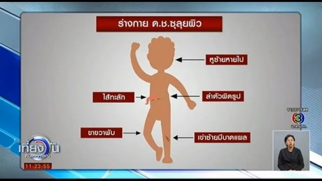 โดยลักษณะภายนอกของศพพบว่า ลำตัวมีลักษณะหักครึ่ง ไส้ทะลัก ขาขวาพับผิดรูป มีบาดแผลที่เข่าซ้าย และหูซ้ายหายไป