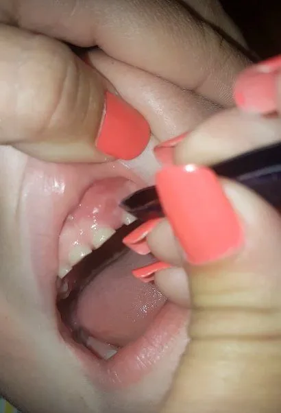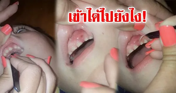 เข้าไปได้ยังไง แม่สังเกตว่าลูกมีพฤติกรรมแปลกๆ ก่อนจะเห็นของแข็งสีขาว ติดใน “เหงือก” พอคีบออกมาถึงกับตีลูกเพื่อสั่งสอน