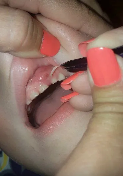โดยคุณแม่ Sara Guidry จากรัฐลุยเซียนา สหรัฐอเมริกา สังเกตเห็นความผิดปกติของลูกชาย และพบว่าเหงือกของเขามีอะไรขาวๆโผล่ออกมา ก่อนพยายามใช้แหนบดึงมันออกมา