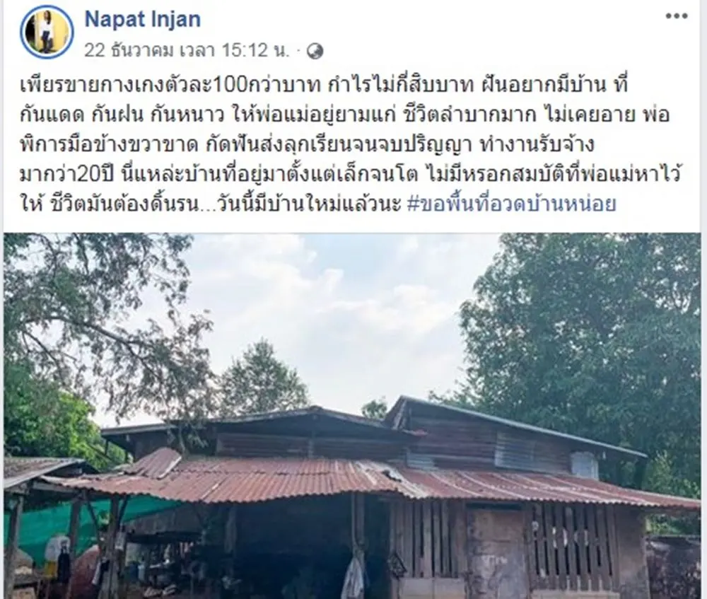 เป็นเรื่องราวตัวอย่างที่ถูกแชร์ต่ออย่างมากในโลกออนไลน์ สำหรับเรื่องราวของสาวแกร่งสู้ชีวิต ขายกางเกงตัวละ 100 บาท จนสามารถเก็บเงินสร้างบ้านให้พ่อกับแม่ได้ ทั้งนี้เรื่องราวดังกล่าวเจ้าของเรื่องแชร์ลงในเฟซบุ๊กส่วนตัวที่ชื่อว่า Napat Injan พร้อมระบุข้อความแนบไว้ดังนี้ “เพียรขายกางเกงตัวละ100กว่าบาท กำไรไม่กี่สิบบาท ฝันอยากมีบ้าน ที่กันแดด กันฝน กันหนาว ให้พ่อแม่อยู่ยามแก่ ชีวิตลำบากมาก ไม่เคยอาย พ่อพิการมือข้างขวาขาด กัดฟันส่งลุกเรียนจนจบปริญญา ทำงานรับจ้างมากว่า20ปี นี่แหล่ะบ้านที่อยู่มาตั้งแต่เล็กจนโต ไม่มีหรอกสมบัติที่พ่อแม่หาไว้ให้ ชีวิตมันต้องดิ้นรน…วันนี้มีบ้านใหม่แล้วนะ #ขอพื้นที่อวดบ้านหน่อย”