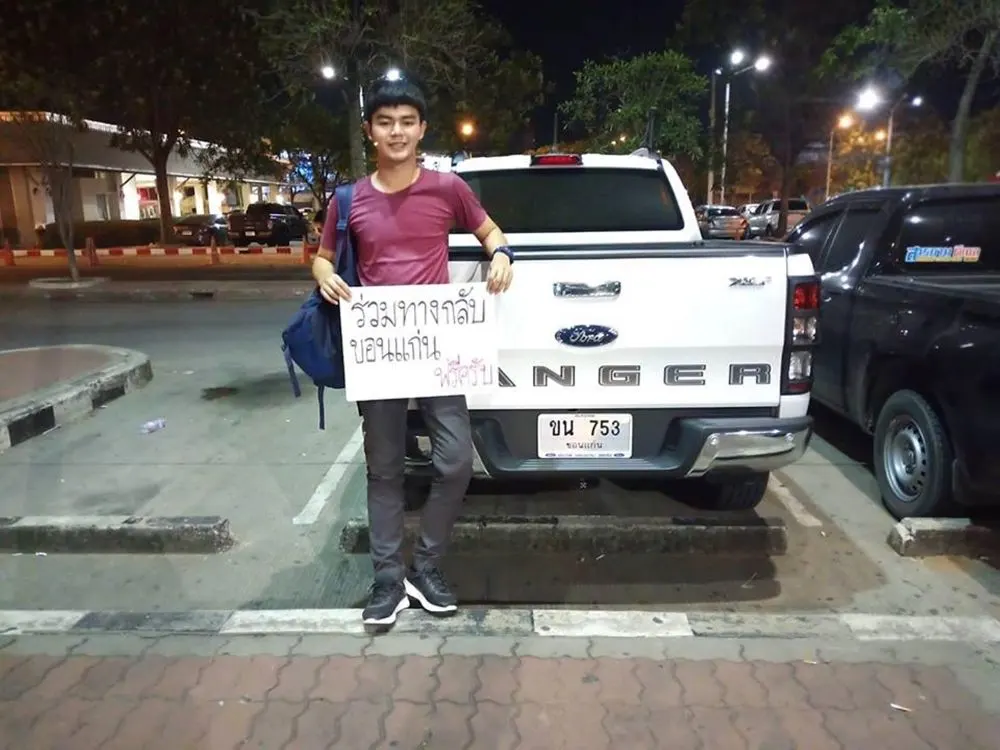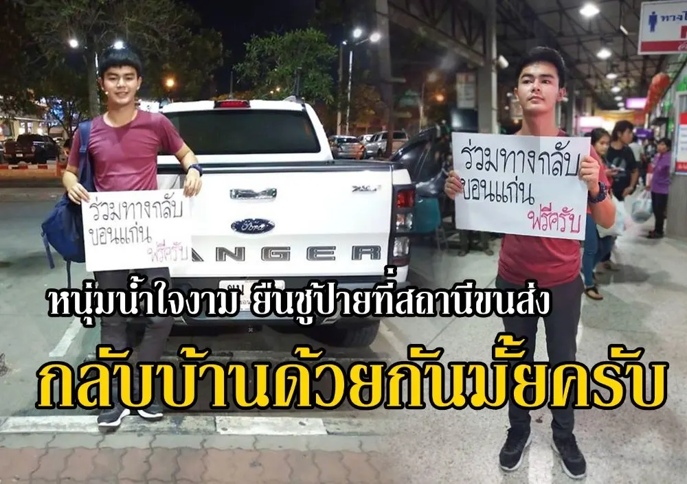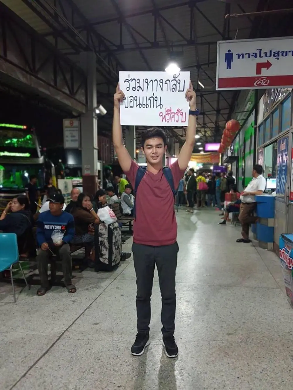 แห่ชื่นชม!!! หนุ่มน้ำใจงาม ยืนชูป้ายที่สถานีขนส่ง "ร่วมทางกลับขอนแก่น" ฟรีครับ