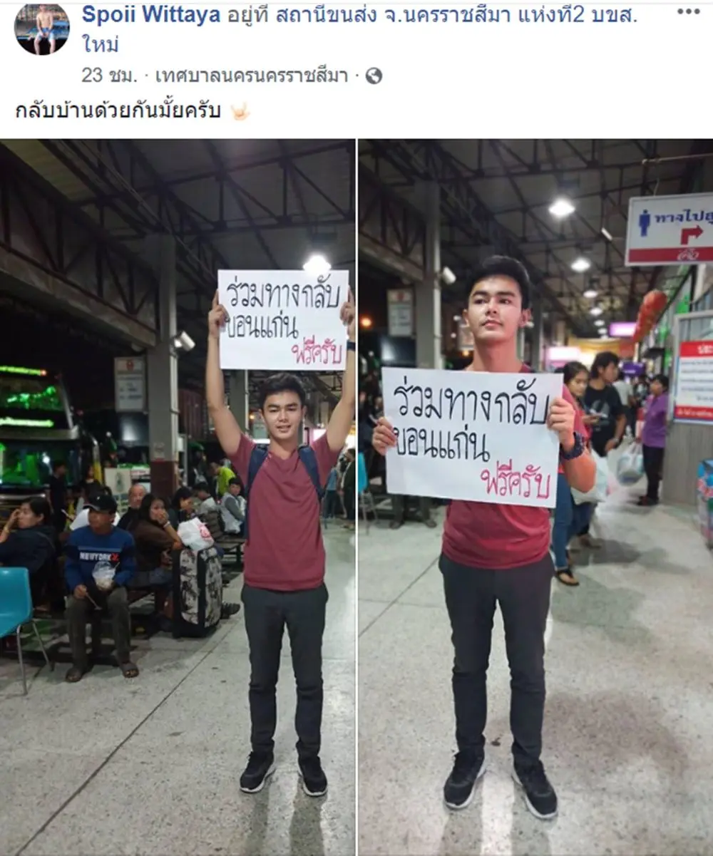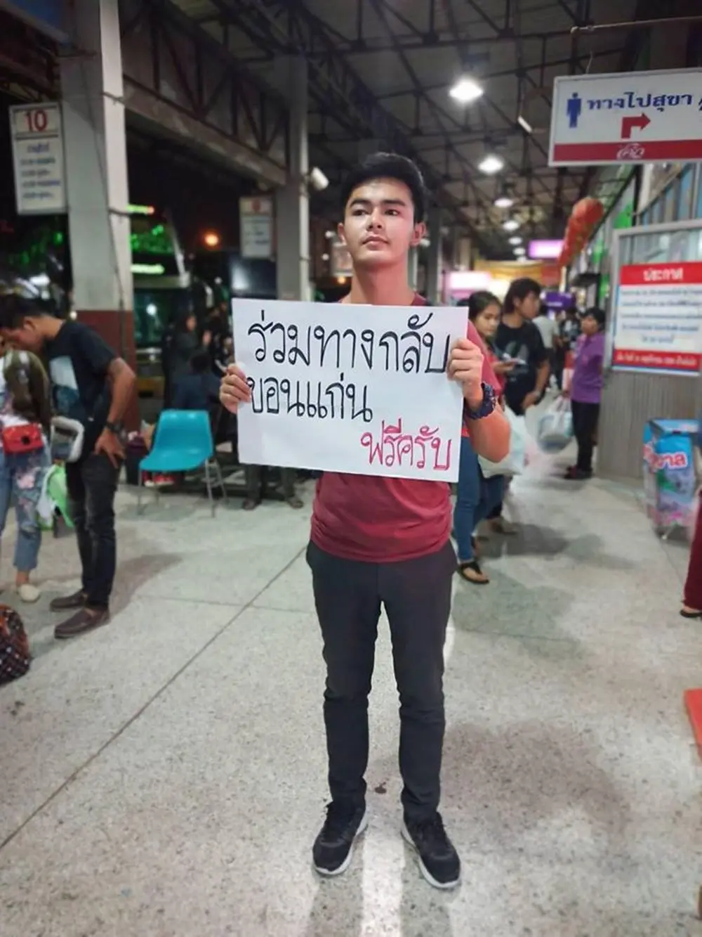 หนุ่มน้ำใจงาม ยืนชูป้ายที่สถานีขนส่ง บขส.ใหม่ จ.นครราชสีมา "ร่วมทางกลับขอนแก่น’" ฟรีครับ ภายหลังส่งถึงที่หมาย ยังได้โพสขอบคุณเพื่อนร่วมทางอีกด้วย*กลับบ้านด้วยกันมั้ยครับ 🤟🏻เทศกาลกลับบ้านที่ต้องได้เจอ #รถเต็ม #จองไม่ทัน #รถเสริมหมด #ใครไม่มีรถกลับขอนแก่นทักมาได้นะครับ #ทางเดียวกันเดี๋ยวไปส่งเอง#เรากลับวัoที่29เวลา2ทุ่มออกจากโคราช #กลับด้วยกันได้คับ ไม่อยากให้ไปนอนรอความหวังจากรถเสริมตามเก้าอี้ บขส. เห็นภาพแล้วมันหดหู่*ส่งผู้โดยสารครบทุกป้าย ถึงขอนแก่นโดยสวัสดิภาพ ขอบคุณเพื่อนร่วมเดินทางครับ