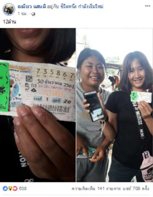 ล่าสุดมีผู้ใช้เฟสบุ๊คชื่อ เหมียว แสนดี ได้ออกมาโพสต์ภาพถือล็อตเตอรี่ รางวัลที่ 1 พร้อมระบุข้อความว่า… 12ล้าน ก่อนภาพถูกเผยแพร่ออกไปมีชาวเน็ตเข้าคอมเม้นท์กันเป็นจำนวนมาก