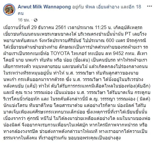 โดยในรถของผู้โพสต์นั้น มี ด.ญ.วรรณรญา วรรณผ่อง หรือ น้องมิลค์ อายุ 11 ขวบ แชมป์บังคับโดรนโลก จากการแข่งขันที่ประเทศจีนร่วมอยู่ด้วย ซึ่งน้องมิลค์บาดเจ็บที่ศีรษะเล็กน้อย จากการถูกกระแทก แต่ผู้โดยสารคนอื่นที่ร่วมอยู่ในรถคันดังกล่าวได้รับบาดเจ็บสาหัส