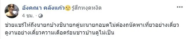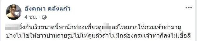 โดย ผู้ใช้เฟซบุ๊กชื่อ "อังคณา คลังแก้ว" ได้โพสต์ข้อความว่า...แมร่...วิ่งกันเร็วขนาดนี้พานักท่องเที่ยวดูอะไร อยากให้กรมเจ้าท่ามาดูบ้างไม่ใช่ให้ชาวบ้านถ่ายรูปไปให้ดูแล้วถ้าไม่มีกล้องกรมเจ้าท่าก็คงไม่เชื่อสิ และอีกข้อความอีกว่า ช่วยแชร์ให้ถึงนายกบ้างสิ นายกตู่นะนายกอบต.ไม่ต้อง ถนัดพาเที่ยวอย่างเดียวดูงานอย่างเดียว ความเดือดร้อนชาวบ้านดูไม่เป็น