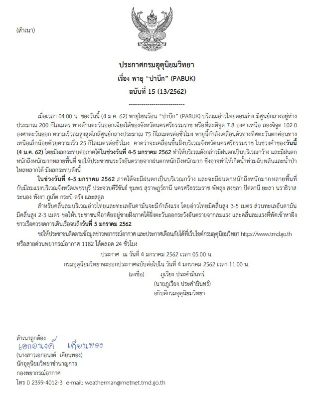 ประกาศกรมอุตุนิยมวิทยา"พายุ “ปาบึก” (PABUK)" ฉบับที่ 15 ลงวันที่ 04 มกราคม 2562