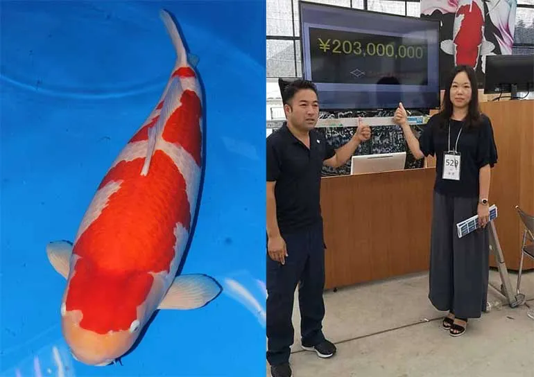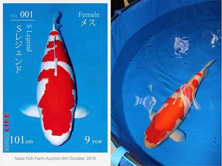 นี่คือปลาคาร์ปแฟนซี ที่มีชื่อว่า S Legend เป็นปลา สายพันธุ์ Kohaku เพศเมีย อายุ 9 ปี จากประเทศญี่ปุ่นมันถูกประมูลซื้อไปเมื่อช่วงเดือนตุลาคม 2018 ที่ผ่านมาด้วยราคา 203,000,000 เยน หรือประมาณ 59.7 ล้านบาท ไม่ต้องอึ้ง ราคาเกือบ 60 ล้านบาท เจ้าปลาคาร์ปตัวนี้มาพร้อมกับความพิเศษด้วยสีแดงและขาวทั้งตัว ความยาวระดับ 101 เซนติเมตร เป็นปลาที่ชนะเลิศการประกวด All Japan Koi Show ปี 2017 มาแล้ว