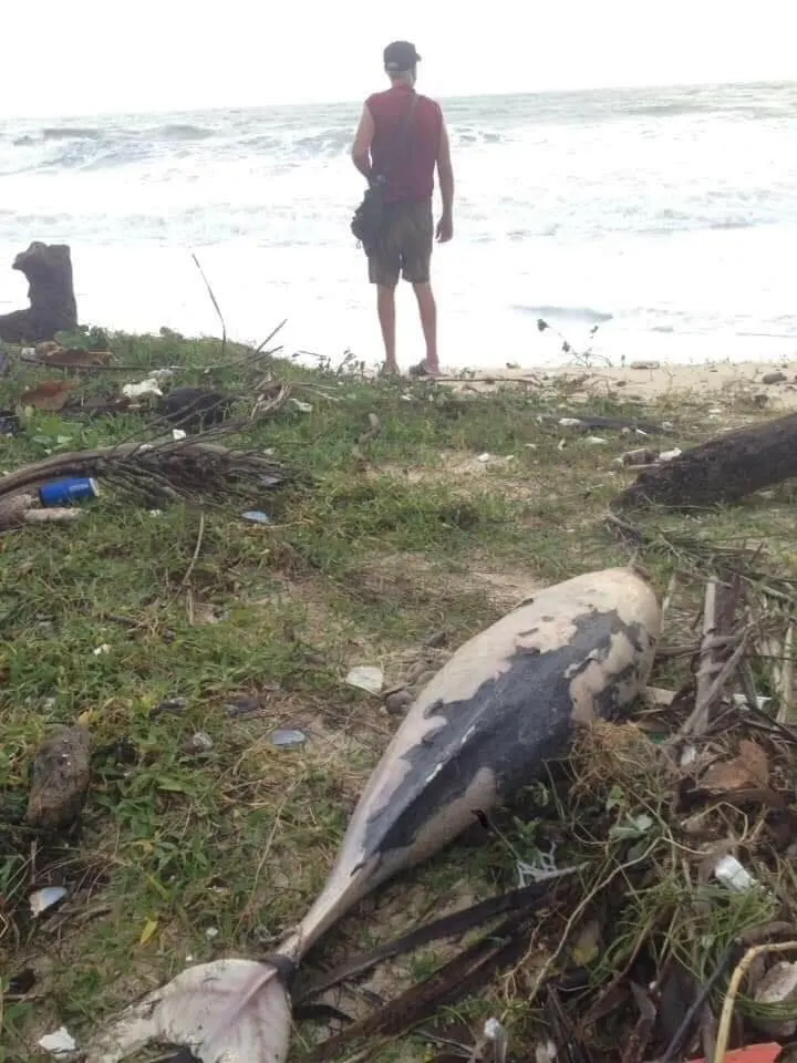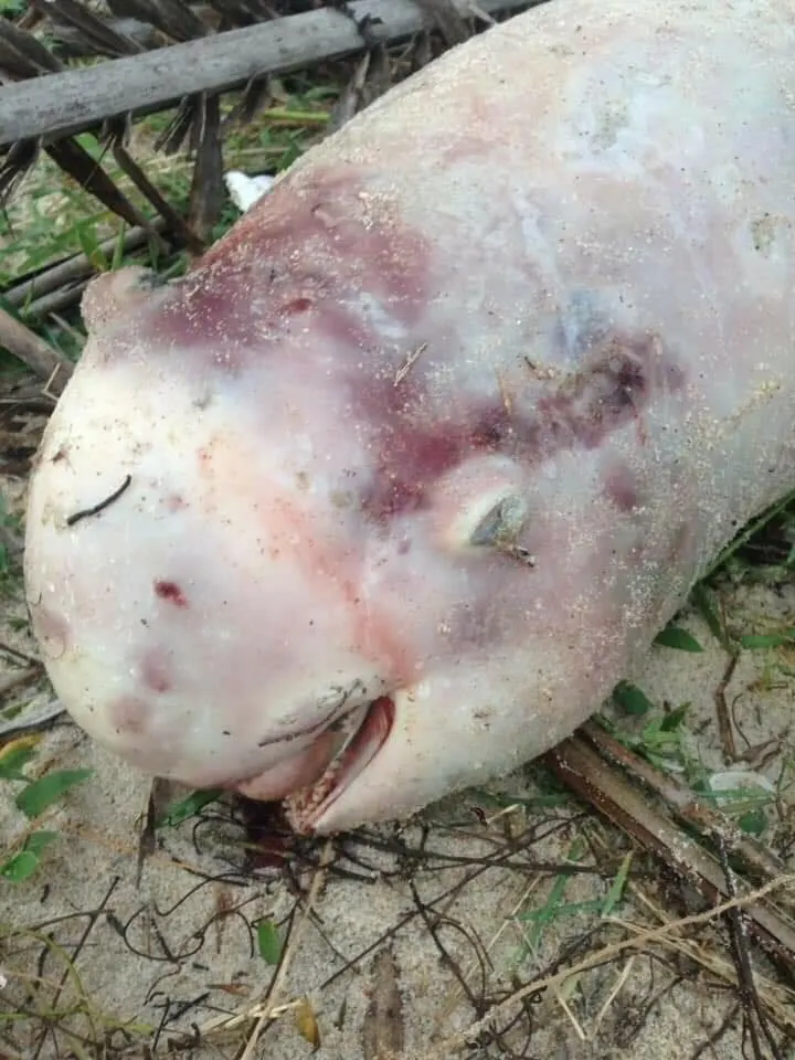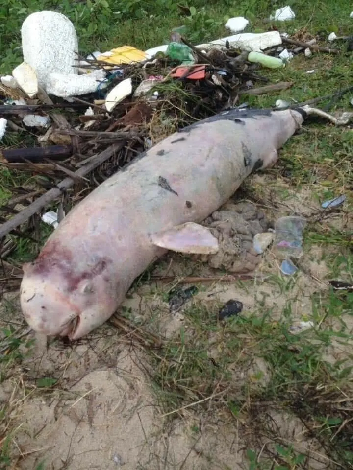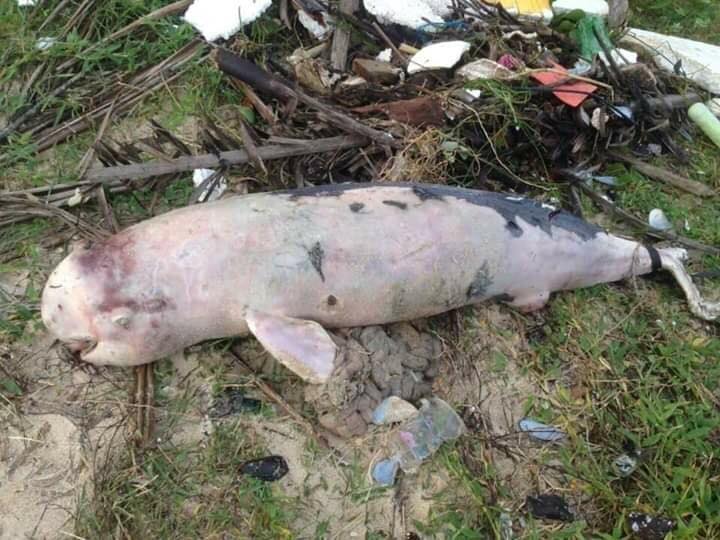 **ตัวนี้ไม่ใช่โลมาสีชมพู (Indo-Chinese humpback dolphin) แต่เป็นโลมาหัวบาตรหลังเรียบ (Finless porpoise) ปกติผิวตัวสีเทาเข้มเกือบดำ ที่เห็นบ่อยๆที่ขนอมครับ ที่เห็นตัวมันเป็นสีชมพูเพราะหนังถลอกหมดเกือบทั้งตัว ยังไงก็เสียใจกับการสูญเสียครับ