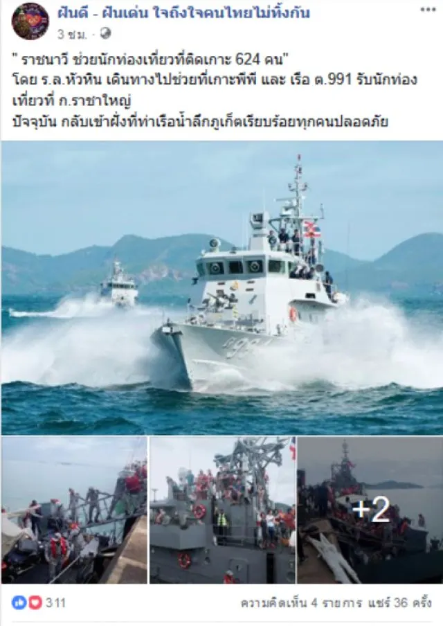 ล่าสุดเพจเฟสบุ๊คชื่อ ฝันดี – ฝันเด่น ใจถึงใจคนไทยไม่ทิ้งกัน ได้ออกมาโพสต์ภาพพร้อมระบุข้อความว่า…. ” ราชนาวี ช่วยนักท่องเที่ยวที่ติดเกาะ 624 คน” โดย ร.ล.หัวหิน เดินทางไปช่วยที่เกาะพีพี และ เรือ ต.991 รับนักท่องเที่ยวที่ ก.ราชาใหญ่ ปัจจุบัน กลับเข้าฝั่งที่ท่าเรือน้ำลึกภูเก็ตเรียบร้อยทุกคนปลอดภัย