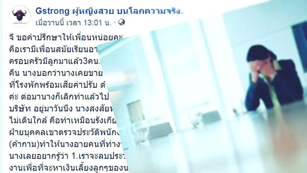 เพจ Gstrong ผู้หญิงสวย บนโลกความจริง. โพสต์เรื่องราวของลูกเพจท่านหนึ่ง ..ฝ่ายบุคคลขุดคุ้ยประวัติประวัติอาชญากรรมเอาไปแฉในที่ทำงาน อับอายจนต้องลาออก ท้ออยากเริ่มชีวิตใหม่