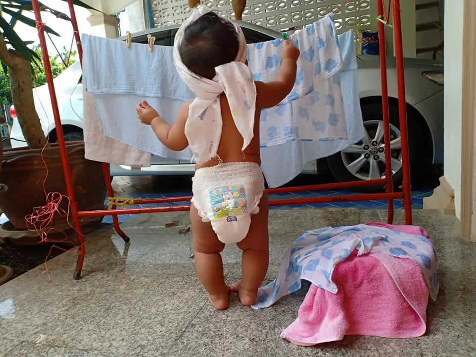 ภาพนี้คุณแม่ก็ถ่ายมาเล่นๆขำๆเพื่อความสนุกสนานนั่นเอง เห็นแล้วก็น่ารักน่าเอ็นดูเสียจริงๆ ขยันทำงานบ้านด้วยตนเองตั้งแต่ยังใส่แพมเพิสซะด้วย