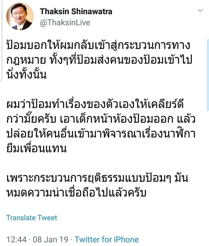 วันที่ 8 ม.ค. 62 นายทักษิณ ชินวัตร อดีตนายกรัฐมนตรี ทวีตข้อความผ่านทวิตเตอร์แอคเคาน์ ล่าสุด ว่า "ป้อมบอกให้ผมกลับเข้าสู่กระบวนการทางกฎหมาย ทั้งๆ ที่ป้อมส่งคนของป้อมเข้าไปนั่งทั้งนั้น ผมว่าป้อมทำเรื่องของตัวเองให้เคลียร์ดีกว่าไหมครับ เอาเด็กหน้าห้องป้อมออก แล้วปล่อยให้คนอื่นเข้ามาพิจารณาเรื่องนาฬิกายืมเพื่อนแทน เพราะกระบวนการยุติธรรมแบบป้อมๆ มันหมดความน่าเชื่อถือไปแล้วครับ".