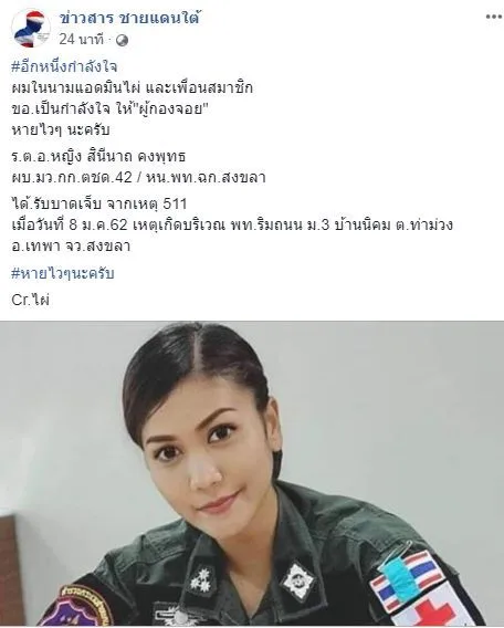 ขณะเดียวกัน เพจเฟซบุ๊ก ชื่อ ข่าวสาร ชายแดนใต้ ได้โพสต์รูปของเธอ และขอเป็นหนึ่งกำลังใจให้เธอ อีกหนึ่งคนและเป้นช่องทางให้ชาวเน็ตเข้ามาแสดงความคีดเห็นส่งกำลังใจไปให้เธอกัน โดยระบุข้อความว่า “#อีกหนึ่งกำลังใจ ผมในนามแอดมินไผ่ และเพื่อนสมาชิก ขอ.เป็นกำลังใจ ให้ผู้กองจอย หายไวๆ นะครับ ร.ต.อ.หญิง สินีนาถ คงพุทธ ผบ.มว.กก.ตชด.42 / หน.พท.ฉก.สงขลา ได้.รับบาดเจ็บ จากเหตุ 511 เมื่อวันที่ 8 ม.ค.62 เหตุเกิดบริเวณ พท.ริมถนน ม.3 บ้านนิคม ต.ท่าม่วง อ.เทพา จว.สงขลา #หายไวๆนะครับCr.ไผ่”