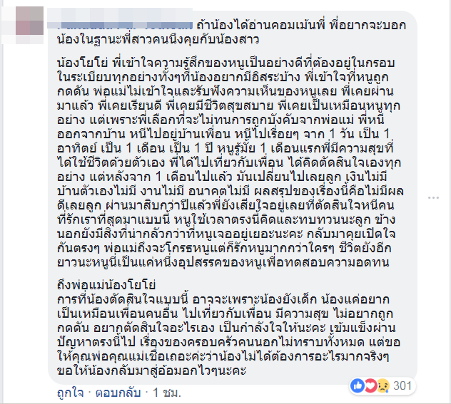น้องโยโย่ พี่เข้าใจความรู้สึกของหนูเป็นอย่างดีที่ต้องอยู่ในกรอบในระเบียบทุกอย่างทั้งๆที่น้องอยากมีอิสระบ้าง พี่เข้าใจที่หนูถูกกดดัน พ่อแม่ไม่เข้าใจและรับฟังความเห็นของหนูเลย พี่เคยผ่านมาแล้ว พี่เคยเรียนดี พี่เคยมีชีวิตสุขสบาย พี่เคยเป็นเหมือนหนูทุกอย่าง แต่เพราะพี่เลือกที่จะไม่ทนการถูกบังคับจากพ่อแม่ พี่หนีออกจากบ้าน หนีไปอยู่บ้านเพื่อน หนีไปเรื่อยๆ จาก 1 วัน เป็น 1 อาทิตย์ เป็น 1 เดือน เป็น 1 ปี หนูรู้มั้ย 1 เดือนแรกพี่มีความสุขที่ได้ใช้ชีวิตด้วยตัวเอง พี่ได้ไปเที่ยวกับเพื่อน ได้คิดตัดสินใจเองทุกอย่าง แต่หลังจาก 1 เดือนไปแล้ว มันเปลี่ยนไปเลยลูก เงินไม่มี บ้านตัวเองไม่มี งานไม่มี อนาคตไม่มี ผลสรุปของเรื่องนี้คือไม่มีผลดีเลยลูก ผ่านมาสิบกว่าปีแล้วพี่ยังเสียใจอยู่เลยที่ตัดสินใจหนีคนที่รักเราที่สุดมาแบบนี้ หนูใช้เวลาตรงนี้คิดและทบทวนนะลูก ข้างนอกยังมีสิ่งที่น่ากลัวกว่าที่หนูเจออยู่เยอะนะคะ กลับมาคุยเปิดใจกันตรงๆ พ่อแม่ถึงจะโกรธหนูแต่ก็รักหนูมากกว่าใครๆ ชีวิตยังอีกยาวนะหนูนี่เป็นแค่หนึ่งอุปสรรคของหนูเพื่อทดสอบความอดทน