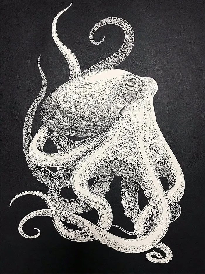 ผลงานที่ทุกท่านได้เห็นกันนี้เป็นภาพปลาหมึกยักษ์ ที่ตัดจากกระดาษ A2 แผ่นเดียวตัดด้วยมือล้วนๆ ลงรายละเอียดสวยงาม แบบสุดๆ แทบจะหาที่ติไม่ได้เลย โดยผลงานชิ้นนั้ถือเป็นงานที่ดีที่สุดของ Fukuda โดยต้องใช้เวลานานถึง 23 เดือนจึงสำเร็จมาเป็นปลาหมึกยักษ์ตัดกระดาษสุดประณีตนี้