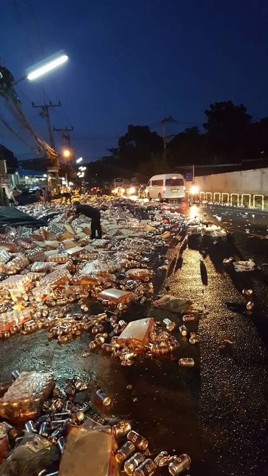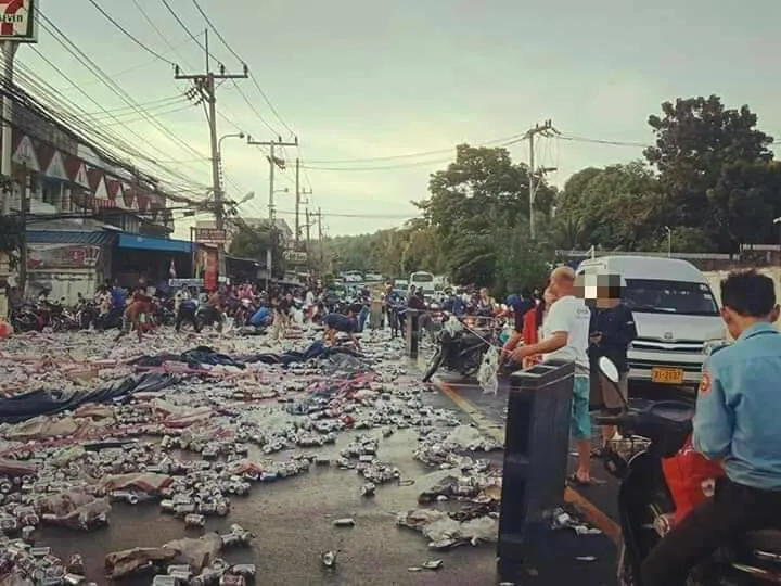 ชาวบ้านมีน้ำใจ ช่วยกันเก็บเบียร์ที่ตกเกลื่อนถนนเอากลับบ้าน จนถนนสะอาดเรียบ! แม้จะมีคนตะโกนว่าปิดกฏหมาย แต่ก็ไม่มีใค่สนใจฟัง พากันขนเบียร์ "กลับบ้าน" ขโมยซึ่งๆหน้า แบบไม่เกรงใจกฏหมาย Cr.มานะ สมบัติ