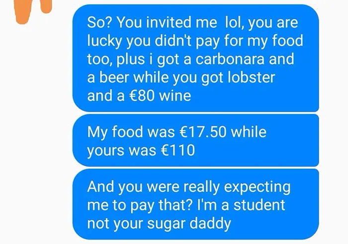 ชายหนุ่มก็ถึงบางอ้อ “แล้วไงอ่ะ? คุณชวนผมนะ คุณโชคดีแล้วที่คุณไม่ต้องจ่ายค่าอาหารของผมด้วย ผมกินแค่บาร์โบนารากับเบียร์ แต่คุณเล่นสั่งล็อบสเตอร์กับไวน์ราคา 80 ยูโร” เขาสวนกลับได้ตรงประเด็นทีเดียว “ค่าอาหารผม 17.50 ยูโร (640 บาท) แต่ของคุณ 110 ยูโร (4,028 บาท) แล้วคุณยังหวังให้ผมต้องจ่ายให้อีกเหรอ ? ผมเป็นแค่นักศึกษานะ ไม่ใช่เสี่ยเลี้ยง”