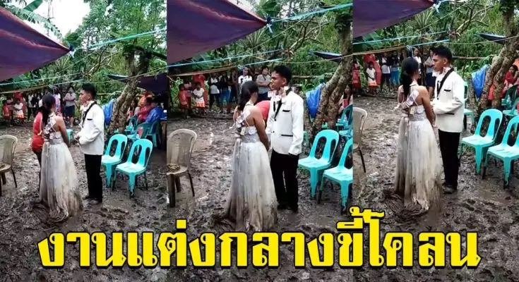 เพราะรักจึงยอม หนุ่มสาวจัดงานแต่งงานกลางลานโคลน เห็นภาพบ่าวสาวแล้วถึงกับฮา ยอมใจจริงๆ (คลิป)