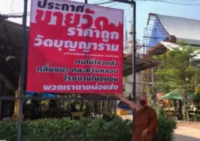 ประกาศขายวัดราคาถูก วัดบุญญาราม ทนไม่ไหวแล้ว กลิ่นขยะและควันหลอมจากโรงงานในชุมชน ส่วนอีกป้ายได้ระบุสาเหตุ ว่าทั้งกลิ่นขยะ กลิ่นโรงหลอม เบียดเบียนวัดและชุมชน สร้างแต่ปัญหา ถนนหนทางก็พัง มีหลายหน่วยงานมาตรวจสอบก็เงียบหาย ไม่เอาจริงเอาจัง ทางวัดจึงประกาศขายด่วน