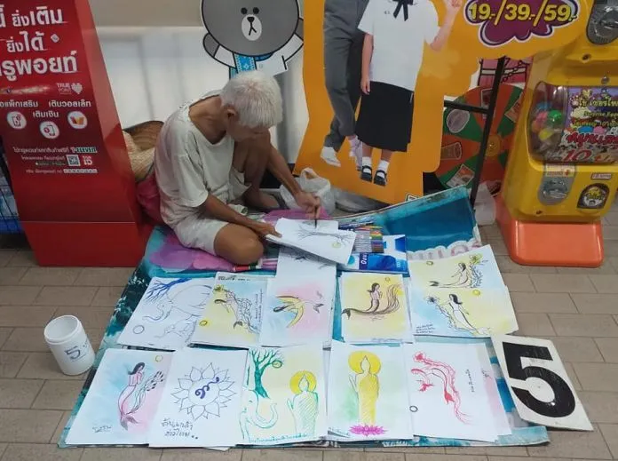 ผู้ใช้เฟซบุ๊กคุณ ณัชศิดา สท้านไตรภพ ได้โพสต์เรื่องราวของคุณลุงท่านหนึ่งลงในเพจของกลุ่มคนเมืองกาญ หลังจากได้พบเจอลุงท่านหนึ่งนั่งวาดรูปศิลปะขายแผ่นละ5บาท เพื่อเลี้ยงปากท้องตัวเอง ในภาพในมีข้อความที่อ่านแล้วสุดซึ้งจริงๆ จนทำให้ผู้คนทราบข่าวต่างพากันไปอุดหนุนคุณลุงคนนี้