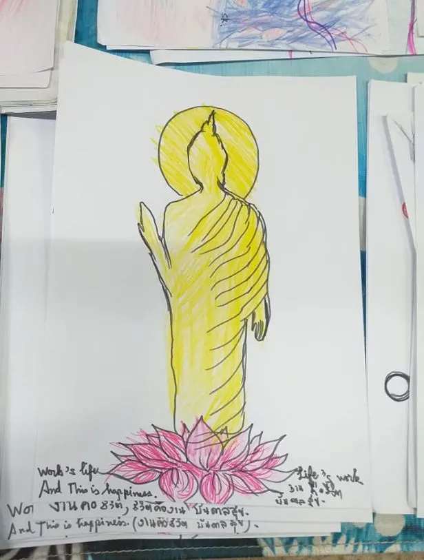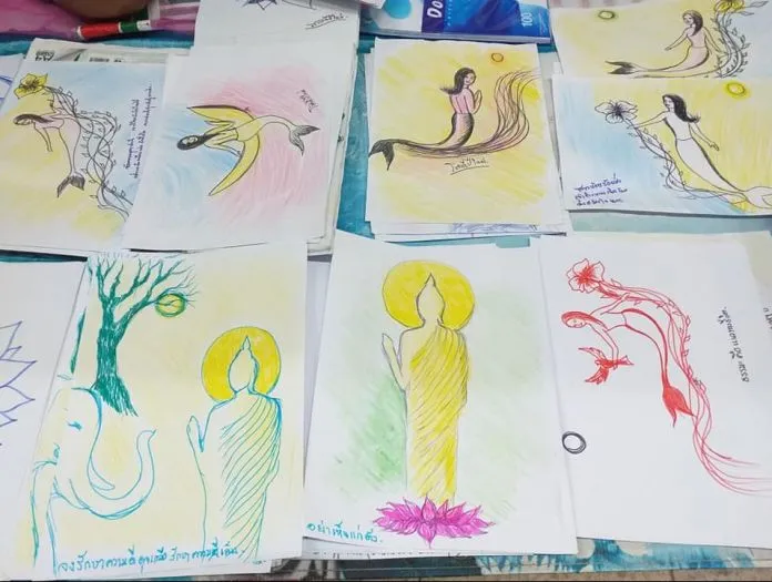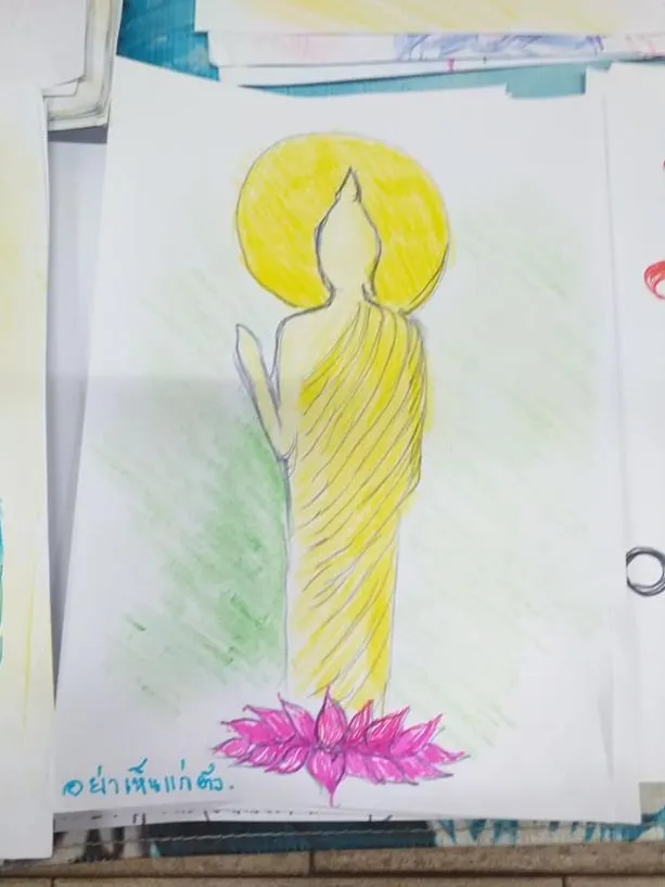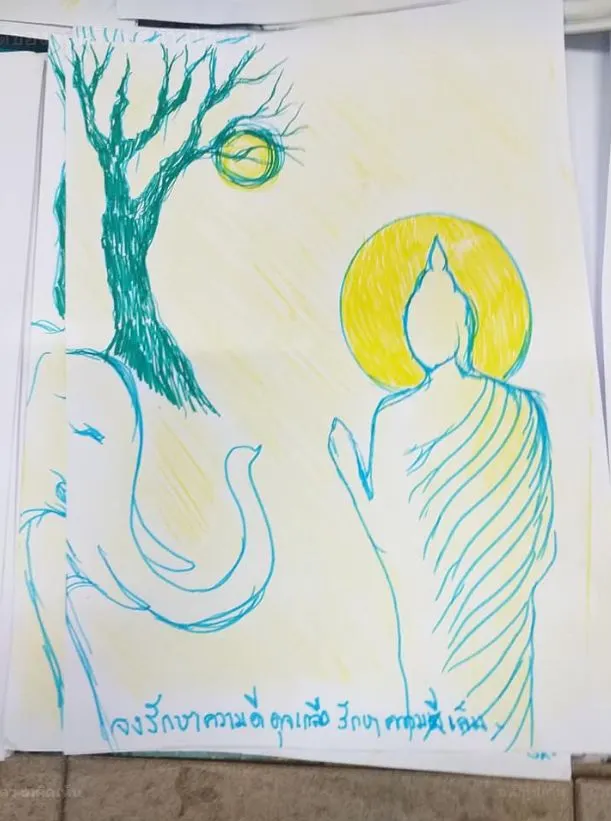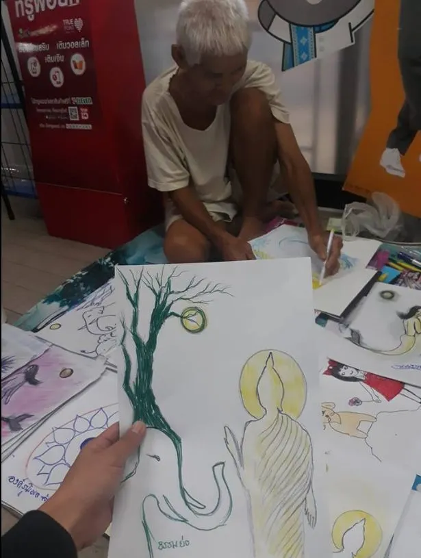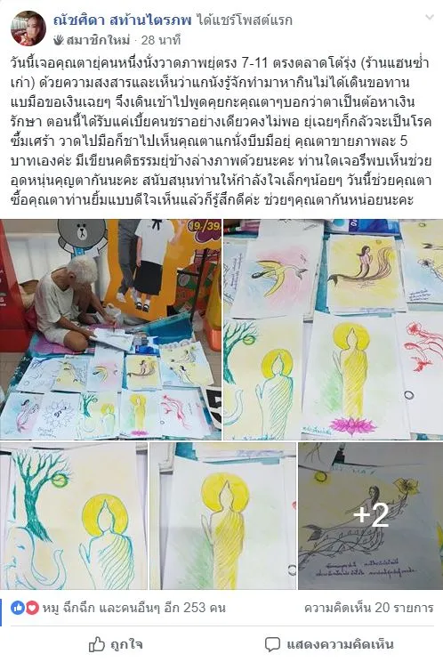 โดยได้ระบุข้อความเรื่องราวไว้ว่า”วันนี้เจอคุณตายุ่คนหนึ่งนั่งวาดภาพยุ่ตรง 7-11 ตรงตลาดโต้รุ่ง (ร้านแฮนซ่ำเก่า) ด้วยความสงสารและเห็นว่าแกยังรู้จักทำมาหากินไม่ได้เดินขอทานแบมือขอเงินเฉยๆ จึงเดินเข้าไปพูดคุยกะคุณตาๆบอกว่าตาเป็นต้อต้องหาเงินรักษา ตอนนี้ได้รับแค่เบี้ยคนชราอย่างเดียวคงไม่พอ ยุ่เฉยๆก็กลัวจะเป็นโรคซึ้มเศร้า วาดไปมือก็ชาไปเห็นคุณตาแกนั่งบีบมือยุ่ คุณตาขายภาพละ 5 บาทเองค่ะ มีเขียนคติธรรมยุ่ข้างล่างภาพด้วยนะคะ ทั้งภาษาไทยและภาษาอังกฤษ ท่านใดเจอรึพบเห็นช่วยอุดหนุ่นคุญตากันนะคะ สนับสนุนท่านให้กำลังใจเล็กๆน้อยๆ วันนี้ช่วยคุณตาซื้อคุณตาท่านยิ้มแบบดีใจเห็นแล้วก็รู้สึกดีค่ะ ช่วยๆคุณตากันหน่อยนะคะ”