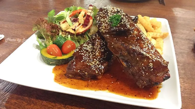 เมนูที่ 2 สำหรับจานหลักที่ขอแนะนำเลยว่าต้องสั่ง สเต็กสะพานโค้ง เพราะว่าอร่อย เนื้อซี่โครงนุ่มมาก ซอสที่ราดมาบอกได้เลยว่า ไม่หวานจนเกินไป อร่อยกำลังดี และคุ้มยิ่งกว่าคุ้มกับ สเต็กซี่โครงสะพานโค้ง มีให้เลือก 2 ไซส์ S กับ L แต่ขอบอกเลยว่าแค่ S ก็ใหญ่สุดๆ แล้ว เสริฟพร้อมผักสดๆ แบบไม่หวงผักกันเลยทีเดียว และเฟรนฟรายด์ทอดร้อนๆ งานนี้คนชอบกินผักกับสเต็กมีฟิน