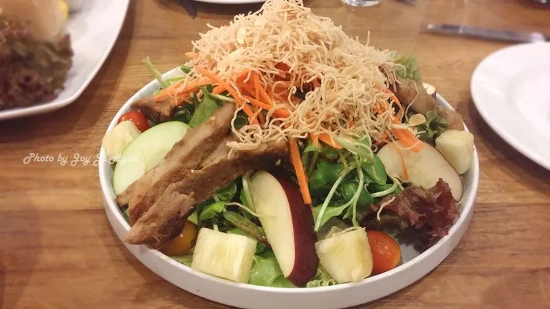 เมนูที่ 6 สลัดหมูย่างหมี่กรอบข้าวกล้อง หมูย่างนุ่มๆ กินคู่กับผลไม้แอปเปิ้ล สับปะรด มะเขือเทศ และขื้นช่ายฝรั่ง กินคู่กับหมี่ข้าวกล้องทอดกรอบ ทอดด้วยน้ำมันข้าวโพดไม่มีคอเรสเตอรอล ขอบอกเด็ดที่น้ำสลัดเพราะเป็นน้ำสลัดแบบแซ่บๆ สไตล์ไทยๆ คล้ายกับน้ำจิ้มแจ่ว
