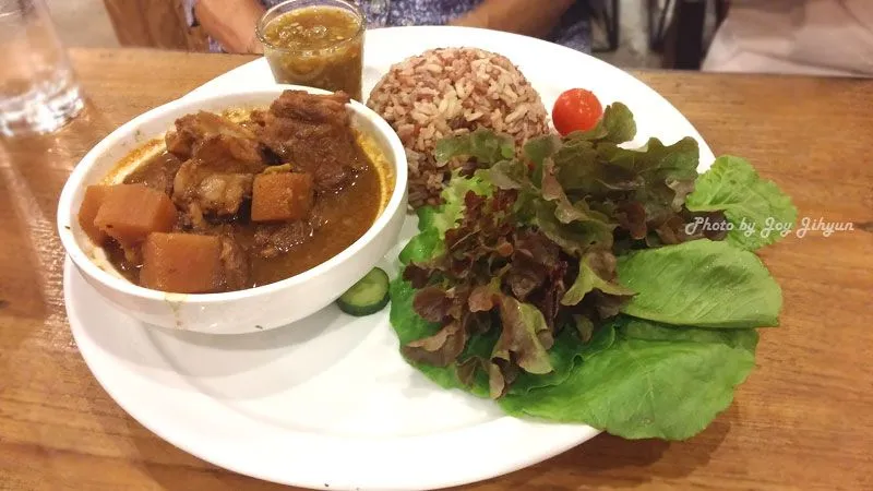 เมนูที่ 7 แกงฮังเลเสิร์ฟพร้อมข้าวกล้อง ผักสด และน้ำจิ้ม หมูนุ่มในน้ำแกงฮังเล และแกนสับปะรด รสชาติกลมกล่อมไม่หวานมาก เสิร์ฟพร้อมผักสดๆ กินแกล้มได้เป็นอย่างดี