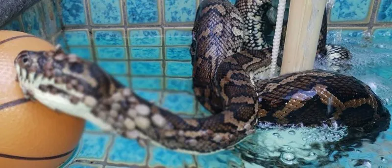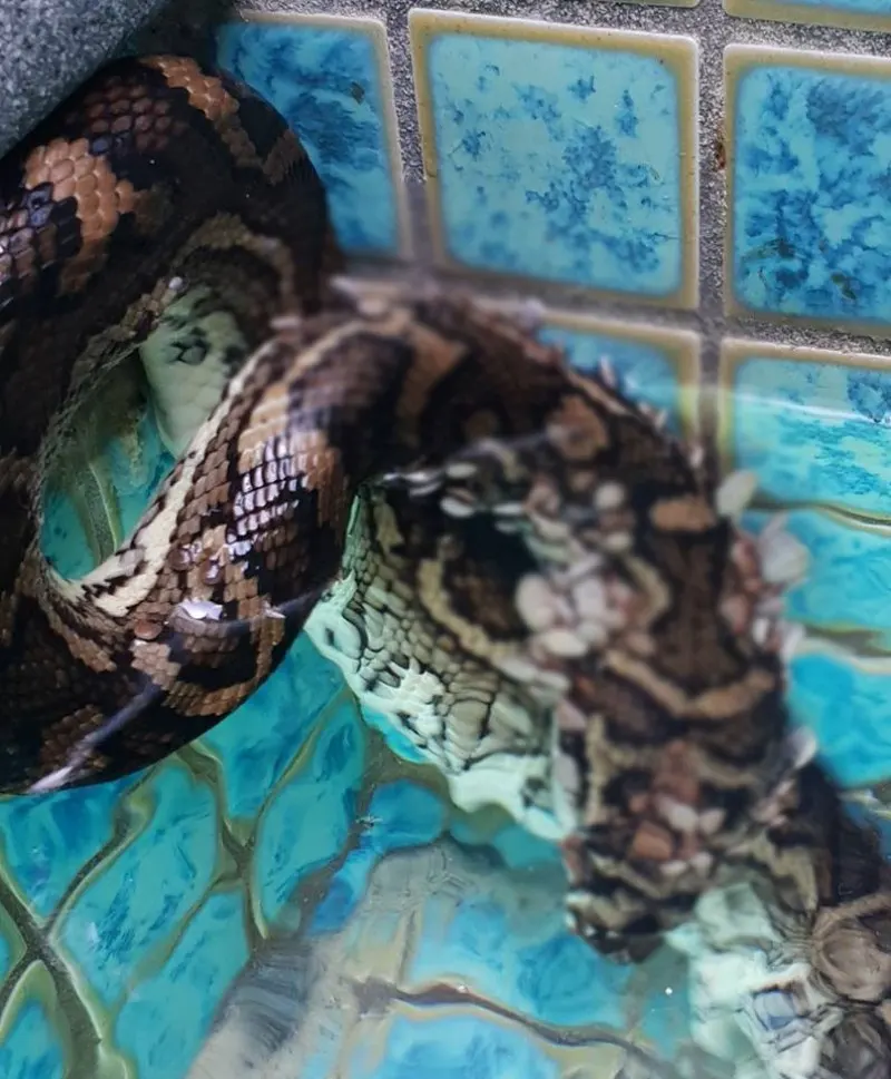 จากการรายงานของสำนักข่าวบีบีซี เมื่อวันที่ 11 มกราคม 2562 ระบุว่า งูตัวหลามคาร์เพ็ต หรืองูหลามพรมตัวนี้อยู่ในสภาพที่ย่ำแย่มาก มันดูอ่อนแรงและไม่สบายตัวอย่างที่สุด บริเวณหัวของมันมีเห็บเกาะกันอยู่อย่างแน่นหนาจนผิวหนังบวม และมันคงรู้สึกทรมานมาก ๆ ด้วยความที่มันไม่สามารถเอาเห็บออกเองได้ มันจึงเลื้อยลงมาในสระว่ายน้ำ ตั้งใจว่าจะเห็บหลุดออกไป แต่ก็ไม่เป็นผล