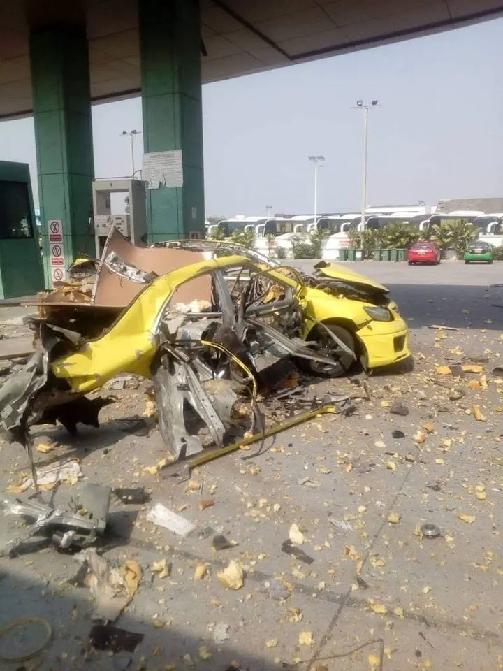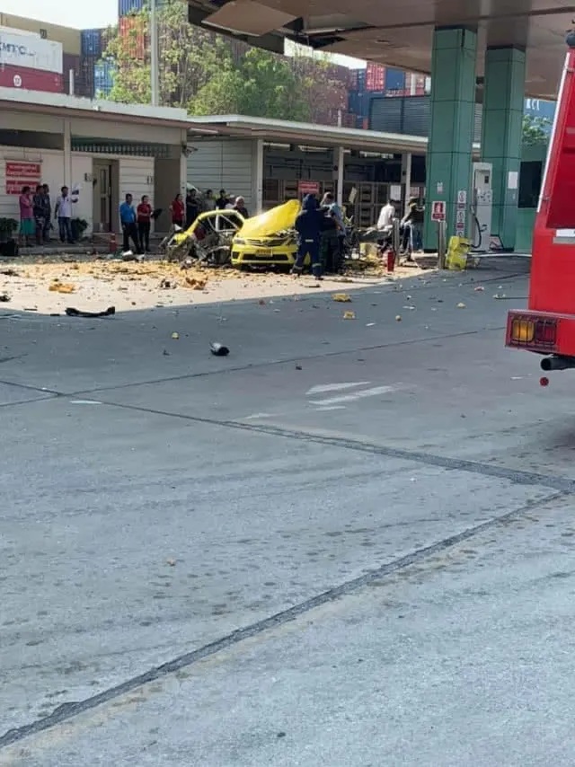ภายในปั้ม พบรถแท็กซี่รถแท็กซี่ยี่ห้อโตโยต้า รุ่นแอลติส สีเหลือง ทะเบียน ทว 1842 กทม. สภาพพังฉีกขาดจาก แรงอัดระเบิดดของแก๊ส