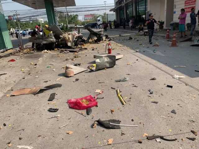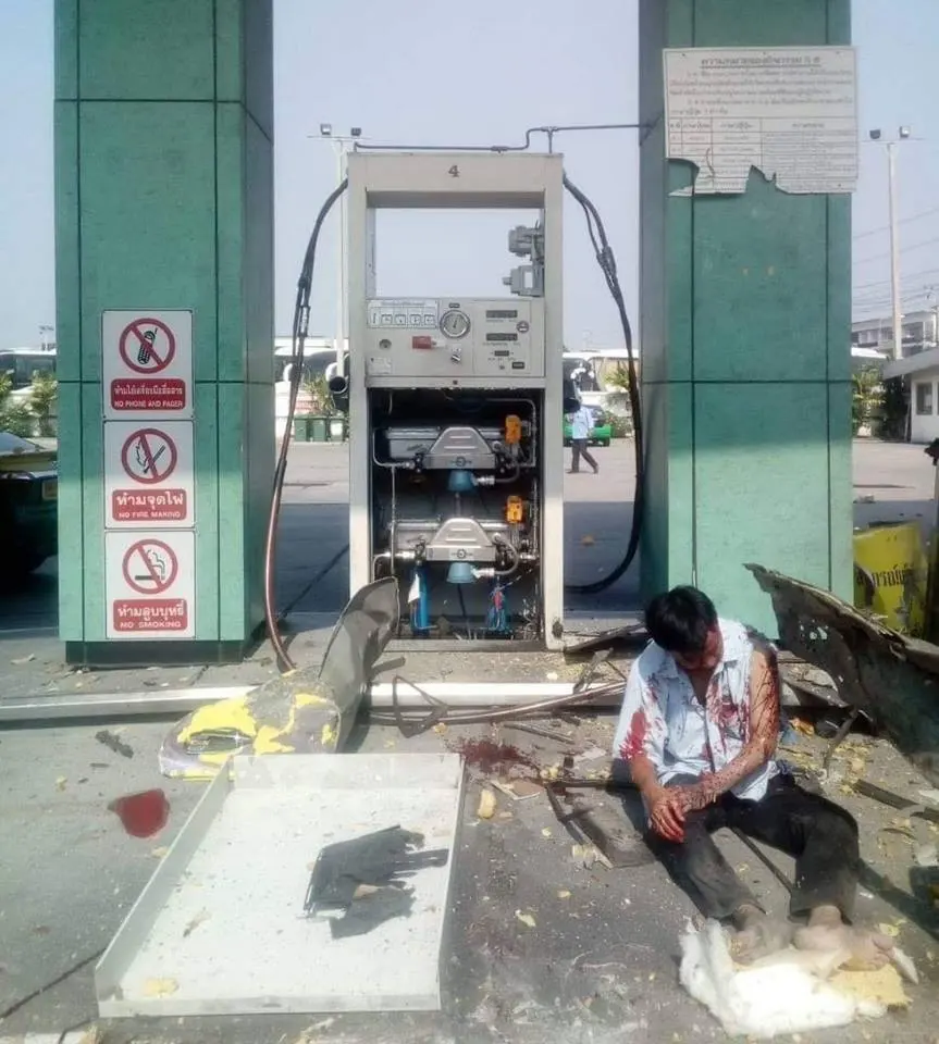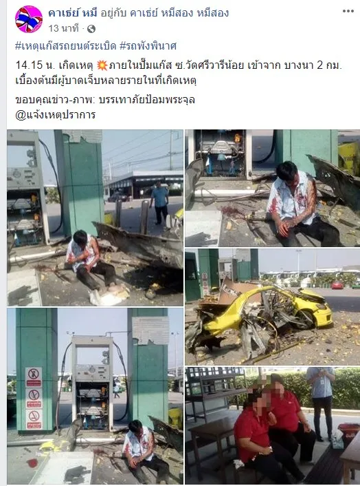 ส่วนหัวจ่ายแก๊สได้รับความเสียหาย ฝาตู้เปิด และเพดานปั้มได้รับความเสียหาย เบื้องต้นนำผู้ได้รับบาดเจ็บส่งรพ.บางพลีแล้ว