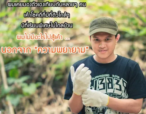 จากวันนั้นผมเลยตั้งใจว่า ผมจะต้องสำเร็จให้ได้ คนที่เรียน กศน. ไม่ได้หมายความว่าเป็นเด็กไม่ดีเสมอไปหรอกครับ แต่คนส่วนใหญ่อาจจะมองแบบนั้น ทำให้เราไม่ได้รับการศึกษาเท่าที่ควร มีเพื่อนผมหลายคนครับที่อยากจะเรียนต่อ แต่เพราะติดปัญหาในหลายๆด้าน