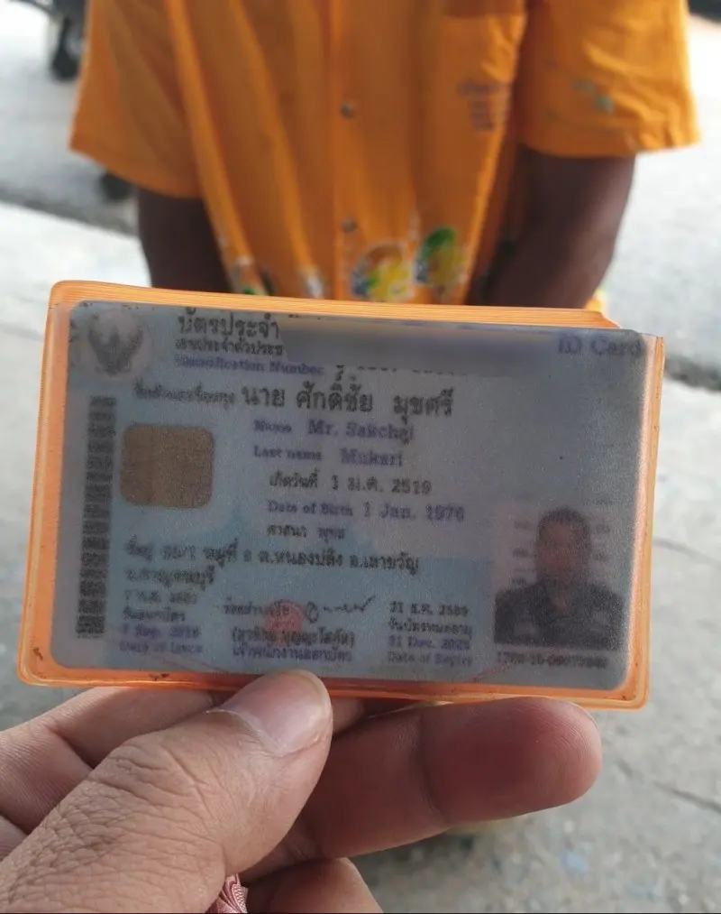 ผมจึงเรียกน้าคนนี้มานั่งในร่มบนฟุตบาตในซอยและสอบถามที่มาที่ไปว่าทำไมน้ามาทำแบบนี้ ผมคิดในใจว่าเป็นพวกมิจฉาชีพหรือป่าว?มาสร้างเรื่องราวให้คนเขาสงสารเพื่อขอเงินใช่มั๊ย?ระหว่างที่พูดคุยผมก็ลองสังเกตุการแต่งตัวของน้าเขามองๆดูก็ไม่แย่มากถือว่าดีรองเท้าก็มีใส่ไม่ได้แต่งตัวเลอะๆชวนสงสารหรือเขาอาจไม่ใช่มิฉาชีพแต่อาจเดือดร้อนจริงๆก็เป็นได้ คุยไปสักพักก็มาสังเกตุเห็นในมือน้าเขากำอะไรไว้บางอย่าง ผมจึงขอดูถึงได้รู้ว่าเป็นบัตรประชาชนของน้าเขา(รูปในบัตรกับตัวจริงตรงกัน)