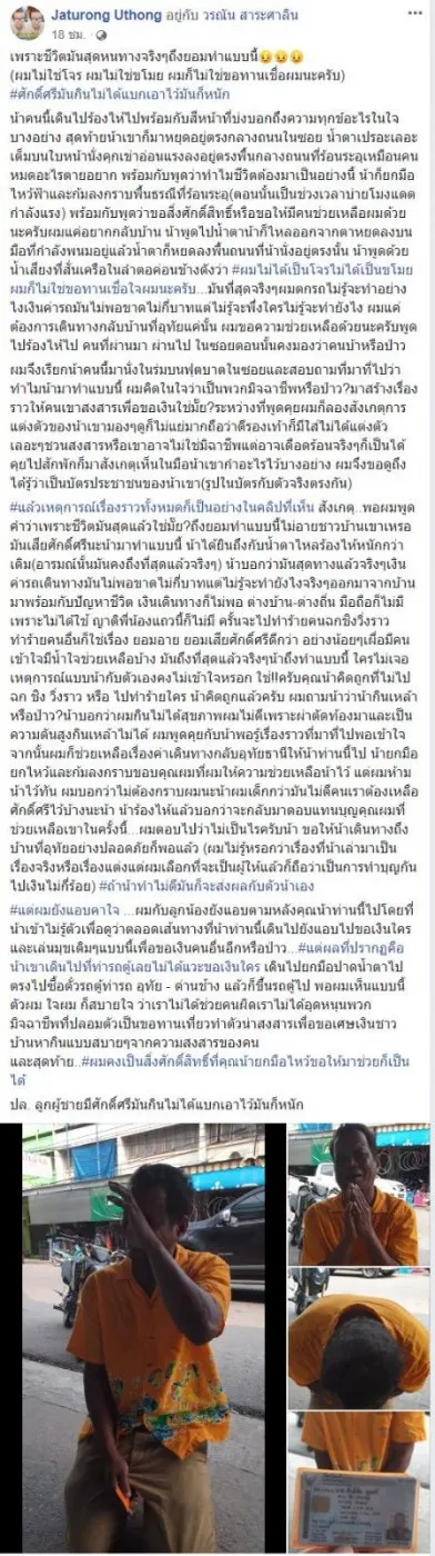 เรียกได้ว่าเป็นเรื่องราวที่มีคนแห่แชร์และให่ความสนใจกันเป็นจำนวนมาก สำหรับเรื่องราวดีๆที่ผู้ใช้เฟสบุ๊คที่ใช้ชื่อว่า Jaturong Uthong ได้โพสต์เรื่องราวของหนุ่มใหญ่รายหนึ่งที่ไม่มีเงินกลับบ้าน สุดท้ายต้องยอมเสียศักดิ์ศรีของเงินคนที่เดินผ่านไปมาเพียงเพื่อต้องการให้พอที่จะนั่งรถกลับบ้าน โดยได้ระบุข้อความว่า...