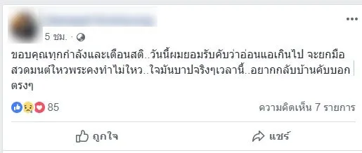 จนกระทั่งเวลา 17.19 น. เจ้าตัวได้ออกมาเคลื่อนไหวพร้อมโพสต์ลงเฟซบุ๊กส่วนตัวอีกว่า "ขอบคุณทุกกำลังและเตือนสติ..วันนี้ผมยอมรับคับว่าอ่อนแอเกินไป จะยกมือสวดมนต์ใหวพระคงทำไม่ใหว..ใจมันบาปจริงๆเวลานี้..อยากกลับบ้านคับบอกตรงๆ"
