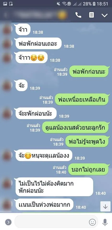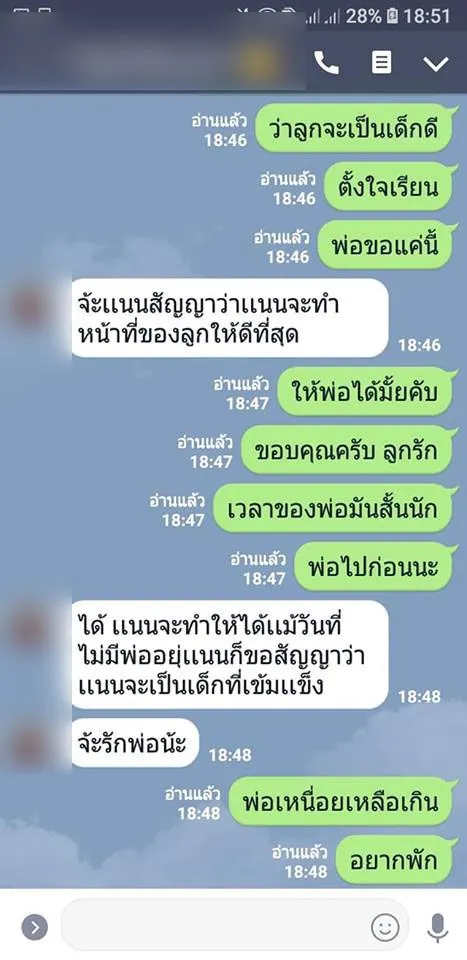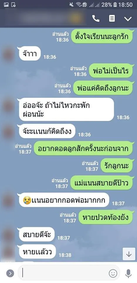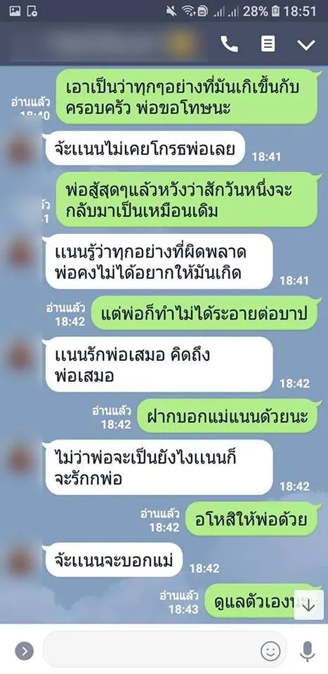 ต่อมาเวลา 18.54 น. หนุ่มคนดังกล่าวได้แคปหน้าจอการสนทนาจากแชทไลน์ ซึ่งเป็นการพูดคุยกับลูกสาว ระบุว่า "พ่อขอโทษนะที่ทำให้ลำบาก..อโหสิให้พ่อนะคิดถึงเสมอลูกรัก"