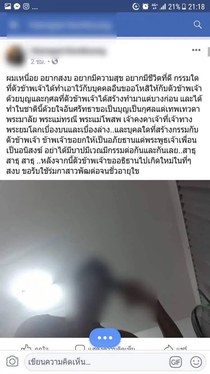 ล่าสุดทำเอาชาวเน็ตเกิดความระทึกใจอีกครั้ง เมื่อหนุ่มคนดังกล่าวได้โพสต์รูปตัวเองพร้อมถือปืนจ่อไว้ที่ขมับ พร้อมระบุข้อความเหมือนเป็นการสั่งลา ระบุว่า "ผมเหนื่อย อยากสงบ อยากมีความสุข อยากมีชีวิตที่ดี กรรมใดที่ ตัวข้าพเจ้าได้ทำเอาไว้กับบุคคลอื่น ขออโหสิให้กับตัวข้าพเจ้า ด้วยบุญและกุศลที่ตัวข้าพเจ้าได้สร้างทำมาแต่ปาง ก่อน และได้ทำในชาตินี้ด้วยใจอันศรัทธา ขอเป็นบุญเป็นกุศลแด่เทพเทวดา พระมาลัย พระแม่ธรณี พระแม่โพสพ เจ้าคงคา เจ้าที่เจ้าทาง พระยมโลกเบื่องบนและเบื่องล่าง และบุคคลใดที่สร้างกรรมกับตัวข้าพเจ้า ข้าพเจ้าขอยกให้เป็นอภัยทาน แด่พระพุทธเจ้า เพื่อเป็นอนิสงฆ์ อย่าได้มีบาปมีเวรมีกรรมต่อกันและกันเลย สาธุ สาธุ สาธุ . . หลังจากนี้ตัวข้าพเจ้า ขออธิฐานไปเกิดใหม่ในที่ๆสงบ ขอรับใช้ร่มกาสาวพัสตร์ต่อจนชั่วอายุไข"