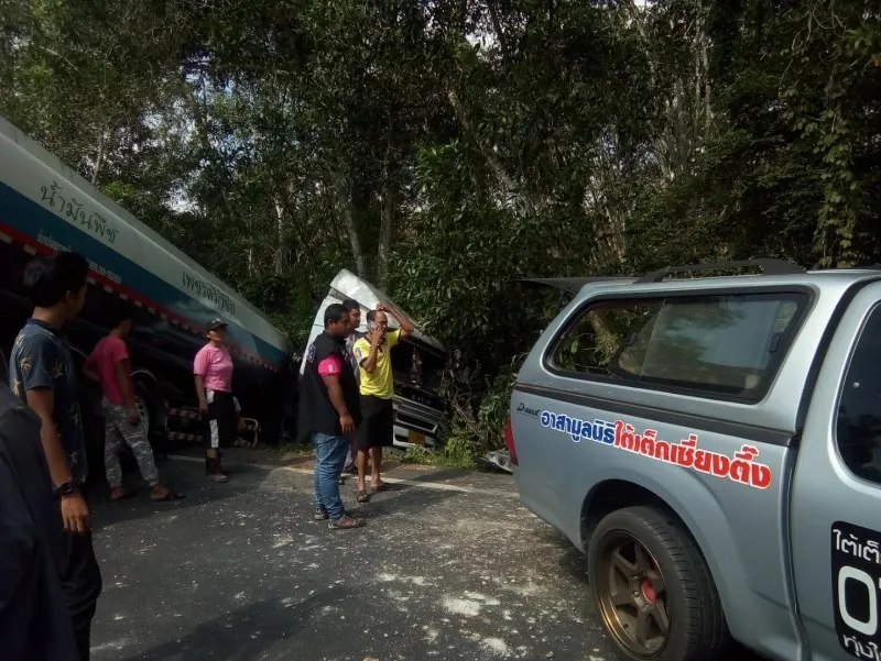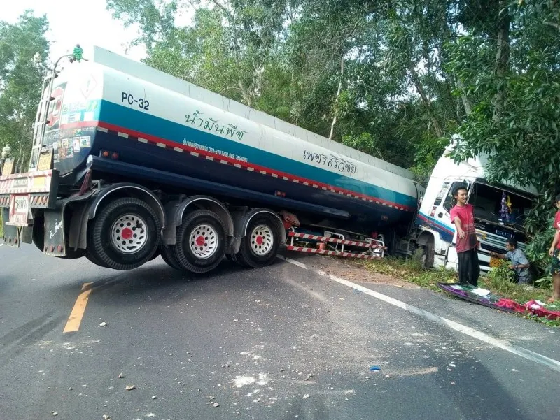 พบรถบรรทุกน้ำมันพืช 22 ล้อ ยี่ห้ออิซูซุ สีขาว ทะเบียน 70-2686 สุราษฎร์ธานี ท่อนหางพ่วง ทะเบียน 70-4140 สุราษฎร์ธานี ของบริษัทเพชรศรีวิชัยเสียหลักพุ่งหลาวลงไปอยู่ในคูข้างทาง ท่อนหางพับขวางอยู่บนถนน สภาพรถด้านหน้าชนต้นไม้พังยับ กระจกแตกกระจาย แรงกระแทกทำให้ร่างคนขับพุ่งทะลุกระจกหน้าลงไปกองอยู่ริมถนนได้รับบาดเจ็บ แต่อาการไม่สาหัส เจ้าหน้าที่หน่วยกู้ภัยใต้เต็กตึ๊ง นำส่ง รพ.ทุ่งใหญ่ ทราบชื่อนายสาโรจน์ แสงทิ้ง อายุ 30 ปี บ้านเลขที่ 71/6 หมู่ 8 ต.ทุ่งตำเสา อ.นาสาร จ.สุราษฎร์ธานี
