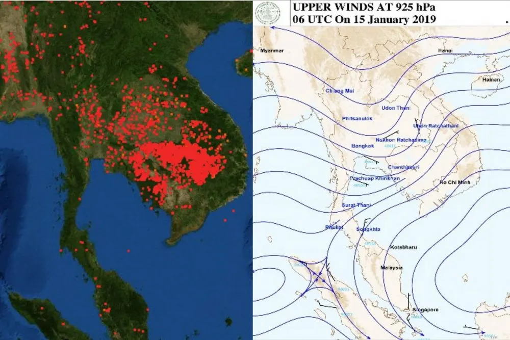อีกทั้งยังพบรายงานศูนย์มิติวิทยาของอาเซียน ที่ติดตามเรื่องการเกิดไฟในภูมิภาคว่า มีหมอกควันที่เกิดจากการเผาไหม้ทางภาคเหนือกับภาคตะวันออกของประเทศกัมพูชา คล้ายกับปรากฏการณ์ไฟป่าที่เกิดขึ้นในประเทศอินโดนีเซียที่ได้กล่าวไปในตอนต้น ซึ่งอาจทำให้กระแสลมพาหมอกควันเหล่านี้มาถึงกรุงเทพได้