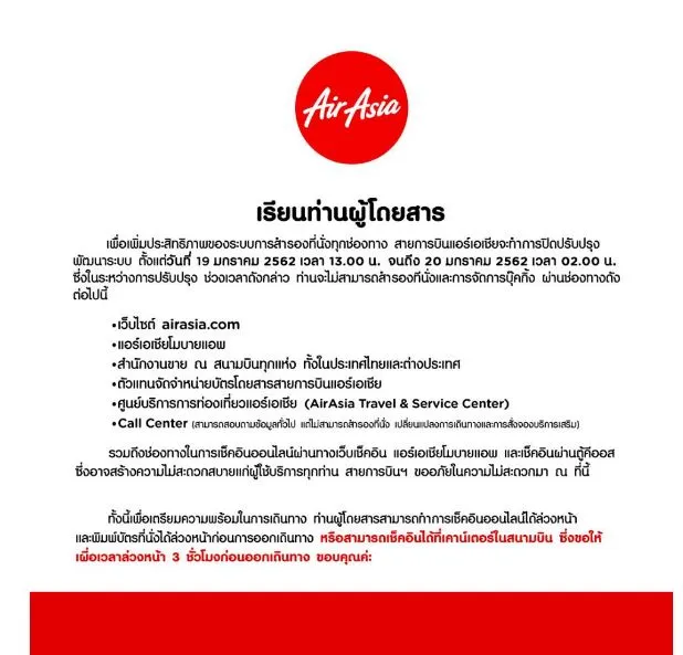 สายการบินแอร์เอเชีย ออกประกาศเตรียมปิดระบบการสำรองที่นั่งทุกช่องทาง ระหว่างวันที่ 19-20 มกราคม 2562 เพื่อพัฒนาระบบ โดยจะปิดระบบตั้งแต่เวลา 13.00 น.ของวันที่ 19 มกราคม – เวลา 02.00 น. ของวันที่ 20 มกราคม 2562 โดยช่วงเวลาดังกล่าว จะไม่สามารถซื้อตั๋ว จองตั๋ว เครื่องบินของแอร์เอเชียได้ในทุกช่องทาง