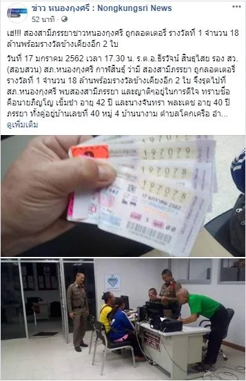 17 มกราคม 2562 เวลา 17.30 น. ร.ต.อ.ธีรวัจน์ สินธุไสย รอง สว.(สอบสวน) สภ.หนองกุงศรี จังหวัดกาฬสินธุ์ ได้รับแจ้งว่ามี สองสามีภรรยา ถูกลอตเตอรี่ รางวัลที่ 1 จำนวน 18 ล้านพร้อมรางวัลข้างเคียงอีก 2 ใบ จึงรุดไปที่ สภ.หนองกุงศรี พบสองสามีภรรยา และญาติๆอยู่ในการดีใจ ทราบชื่อคือ “นายภิญโญ เข็มขำ” อายุ 42 ปี และ “นางจันทรา พละเดช” อายุ 40 ปี ภรรยา ทั้งคู่อยู่บ้านเลขที่ 40 หมู่ 4 บ้านนางาม ตำบลโคกเครือ อำเภอหนองกุงศรีจังหวัดกาฬสินธุ์