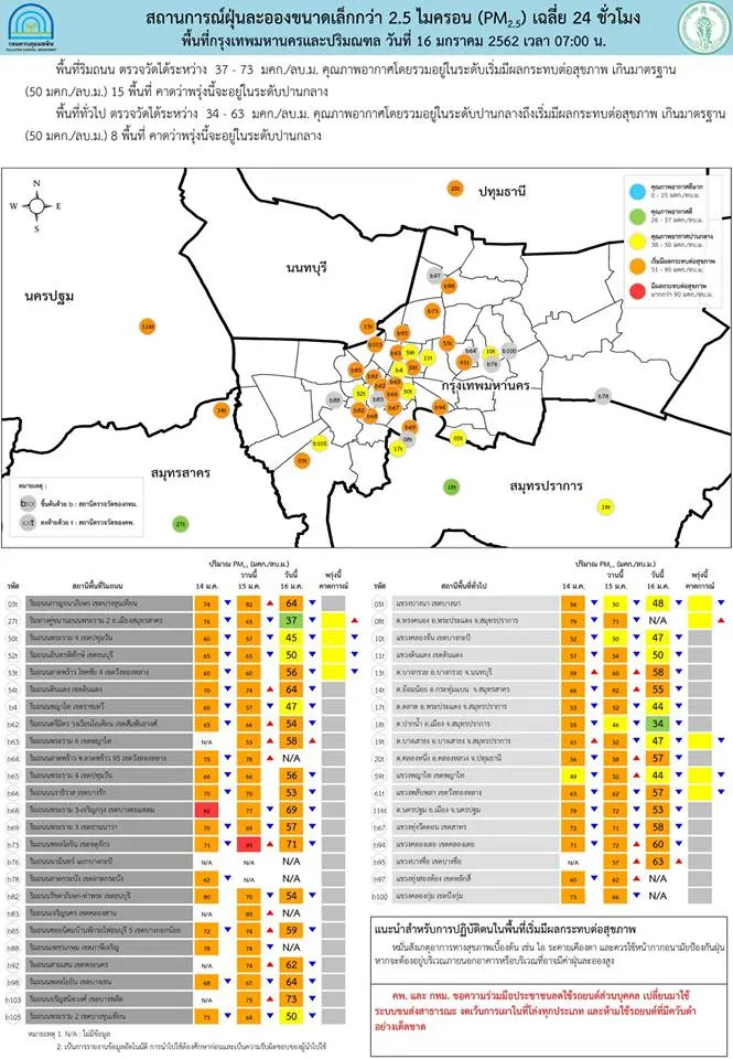 ยังคงติดตามกันอย่างต่อเนื่อง สำหรับสถานการณ์ฝุ่นละออง PM2.5 ในกรุงเทพฯ และปริมณฑล เนื่องจากคุณภาพอากาศโดยรวมเกินมาตรฐาน ส่งผลกระทบต่อสุขภาพ ทำให้มีการรณรงค์หันมาใส่หน้ากากอนามัยเพื่อป้องกันฝุ่นเข้าสู่ร่างกาย ซึ่งวันนี้ (16 ม.ค.) ด้านกรมควบคุมมลพิษ เผยว่าสถานการณ์ฝุ่นละออง PM2.5 ประจำวันที่ 16 มกราคม 2562 ในช่วงเช้าสภาพอากาศปิด มีหมอกในตอนเช้า คุณภาพอากาศในระดับ "ปานกลาง" ถึง "เริ่มมีผลกระทบต่อสุขภาพ" ปริมาณฝุ่นละอองมีแนวโน้มลดลง