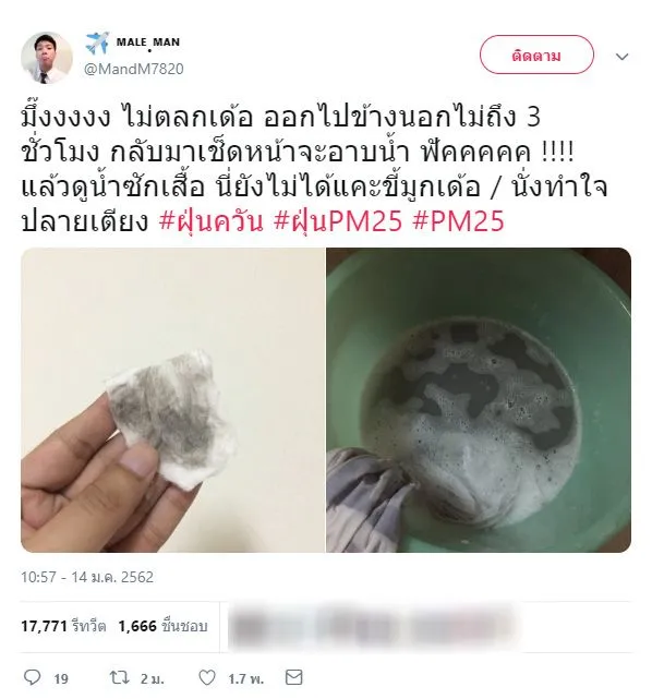 อย่างไรก็ตาม ในโลกโซเชียลพบว่า ชาวเน็ตกว่า 2 หมื่นคนแห่แชร์ภาพผลกระทบฝุ่นละอองจากทวิตเตอร์คุณ MandM7820 ที่เผยแพร่เมื่อวันที่ 14 ม.ค. ที่ผ่านมา โดยทวิตเตอร์คุณ MandM7820 เล่าประสบการณ์ที่เจอกับตนเอง ออกไปข้างนอกเพียง 3 ชั่วโมง ปรากฏว่าเช็ดหน้าเจอคราบฝุ่นสีดำ และน้ำจากการซักผ้าเป็นสีดำ
